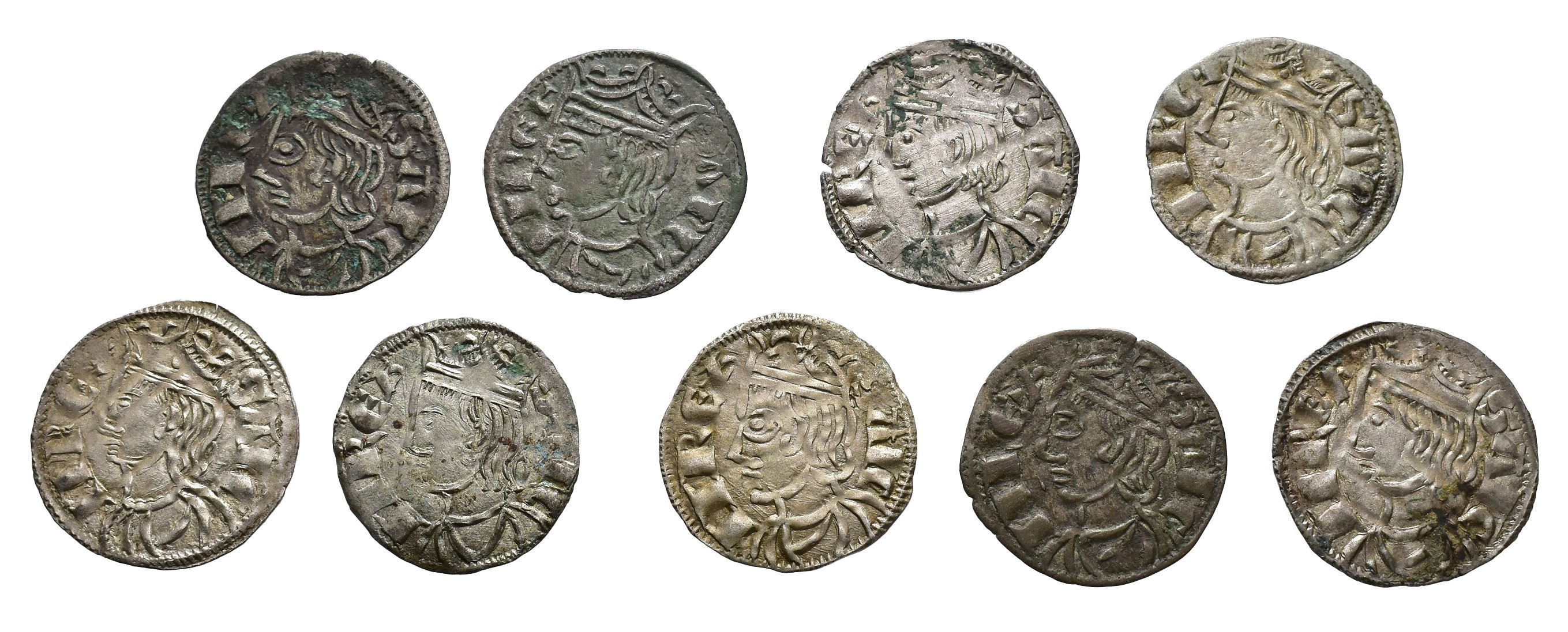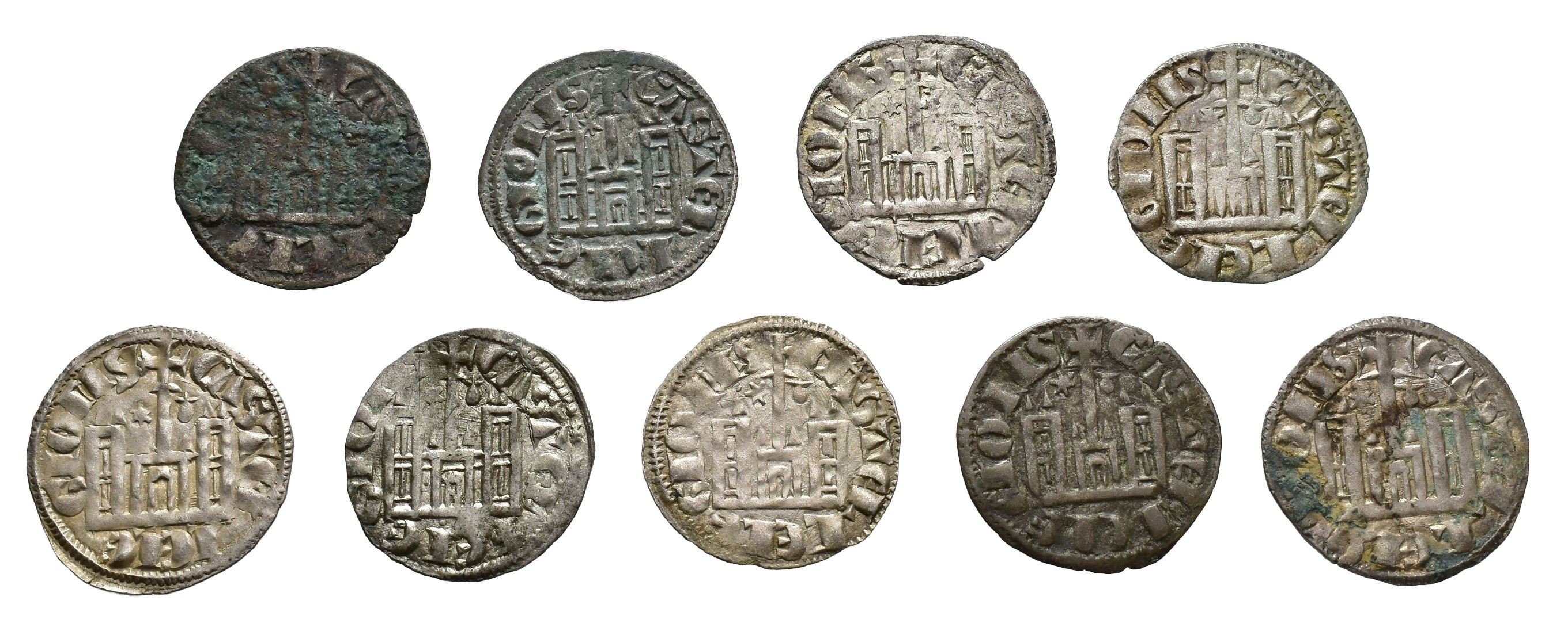 REINOS DE CASTILLA Y LEÓN. SANCHO IV. Lote de 9 cornados, Coruña, *-venera con variantes de adorno en la corona. Orol-ME.228, 230, 233, 235, 237, 239, 241, 243 y 245. MBC-/MBC+.