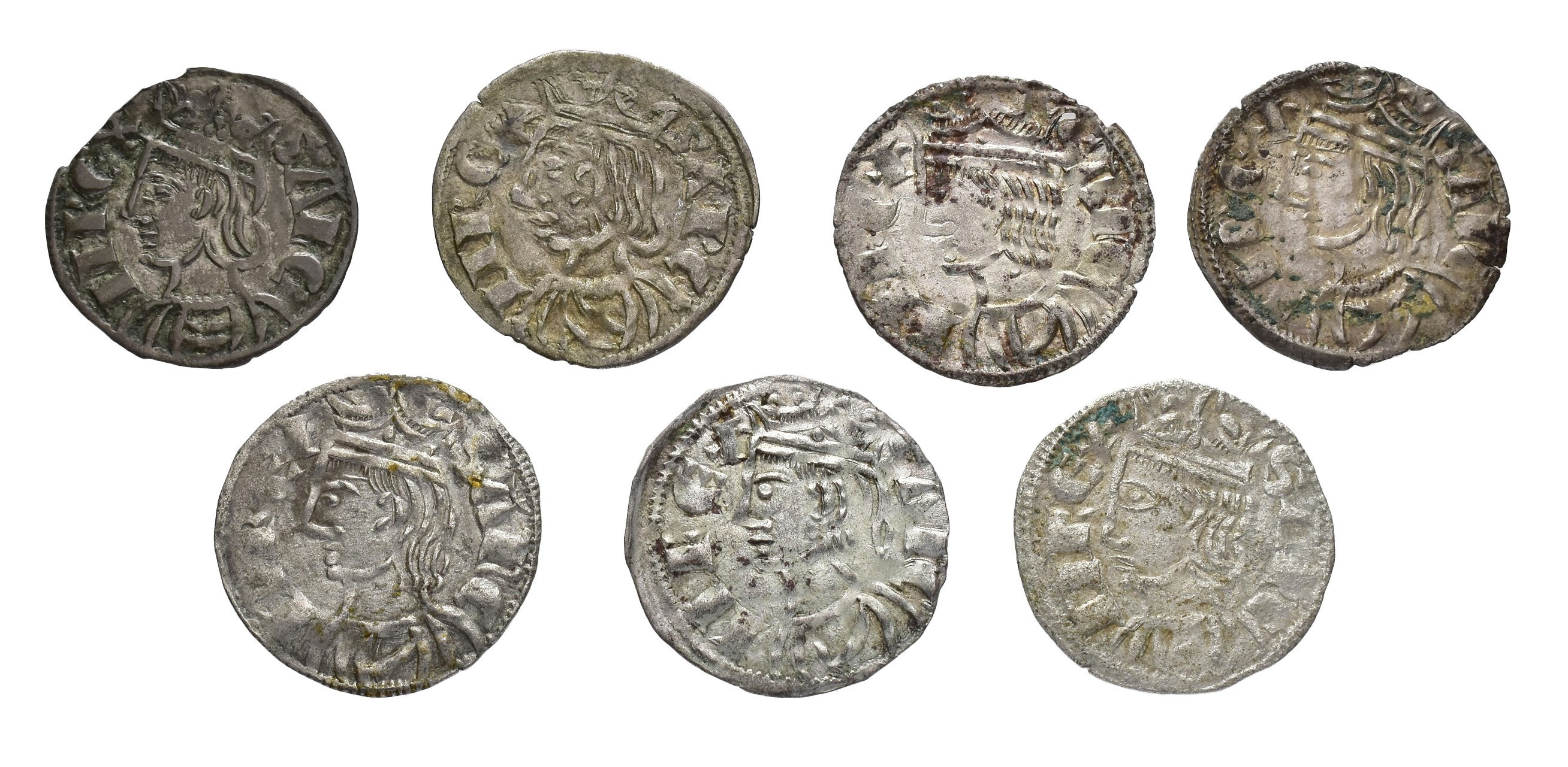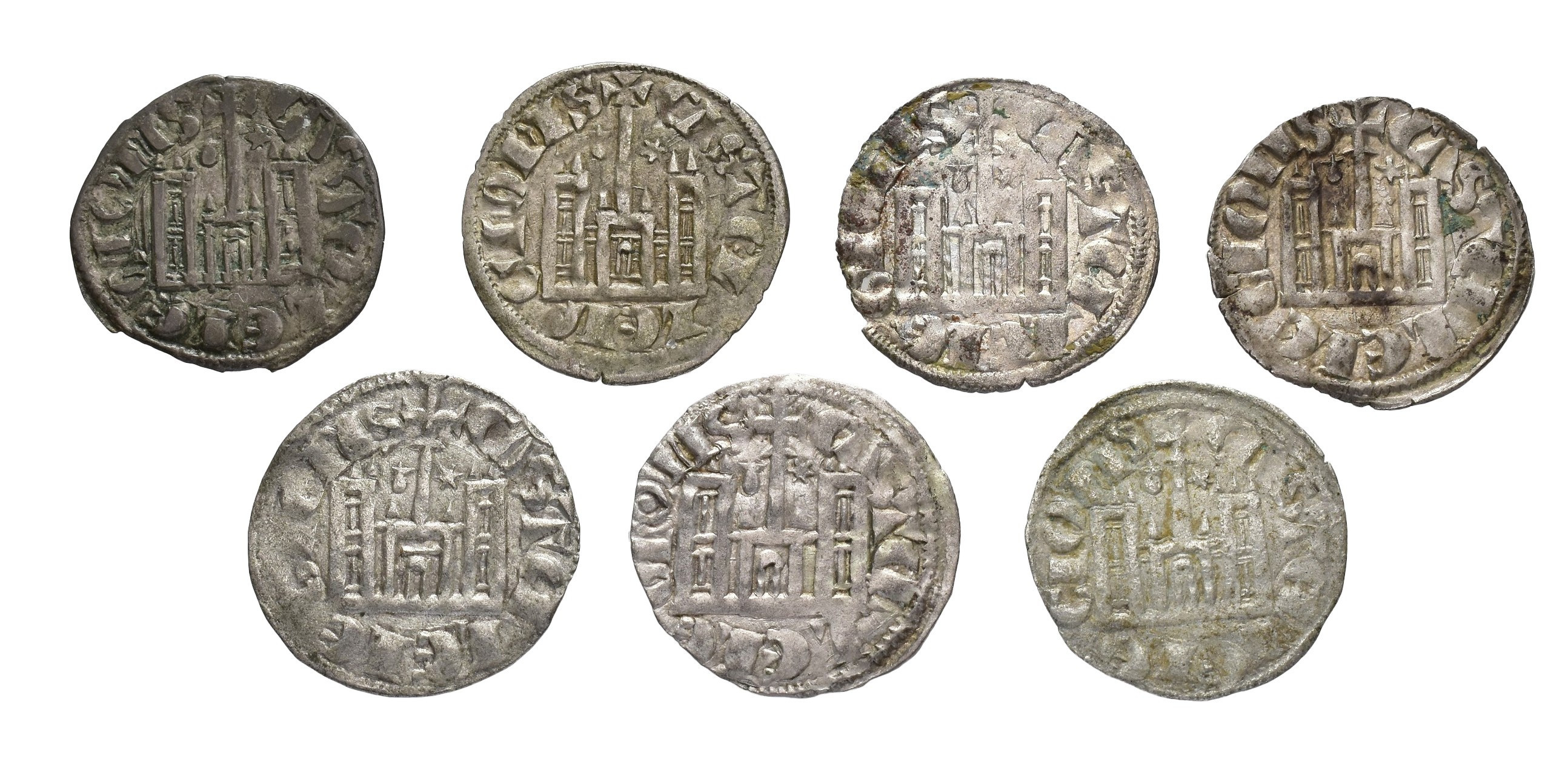 REINOS DE CASTILLA Y LEÓN. SANCHO IV. Lote de 7 cornados, Coruña, venera-* con variantes de adorno en la corona. Orol-ME.210, 252, 255, 258, 260, 262 y 265. MBC-/MBC+.
