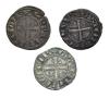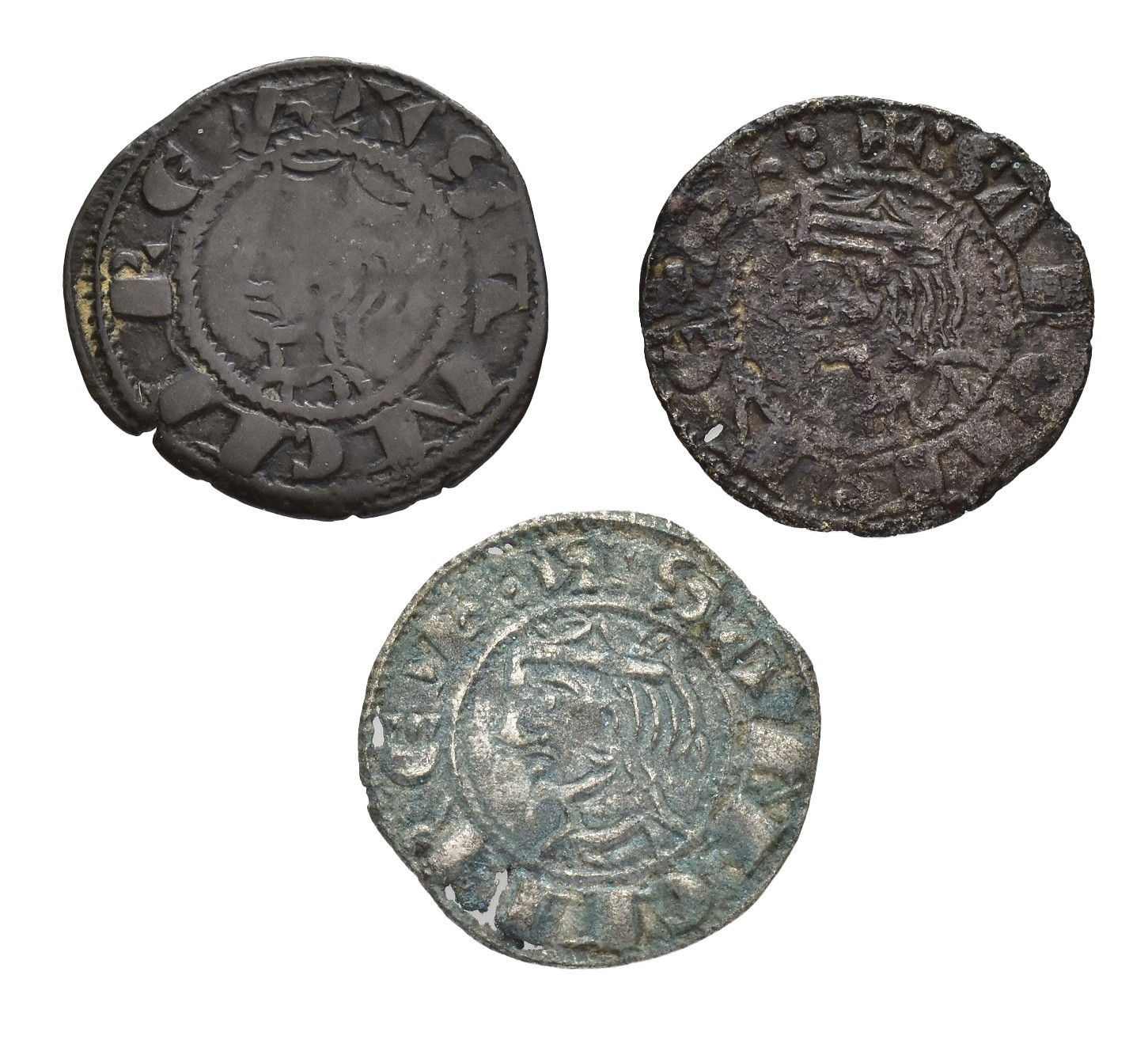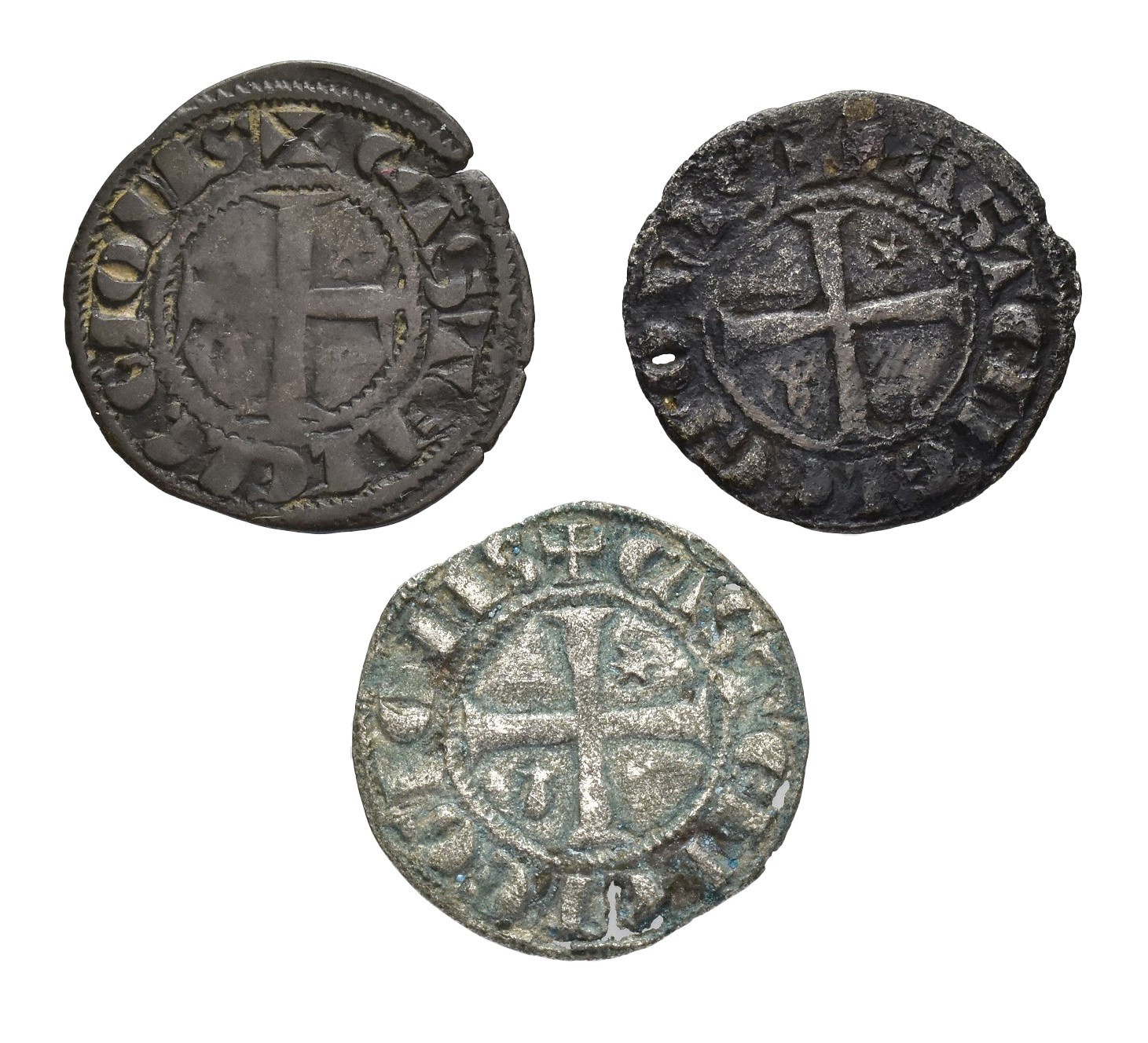 REINOS DE CASTILLA Y LEÓN. SANCHO IV. Lote de 3 meajas coronadas. Coruña. * en el segundo cuartel y venera en el cuarto. Orol-ME.272, 274 y 275. BC+/MBC.