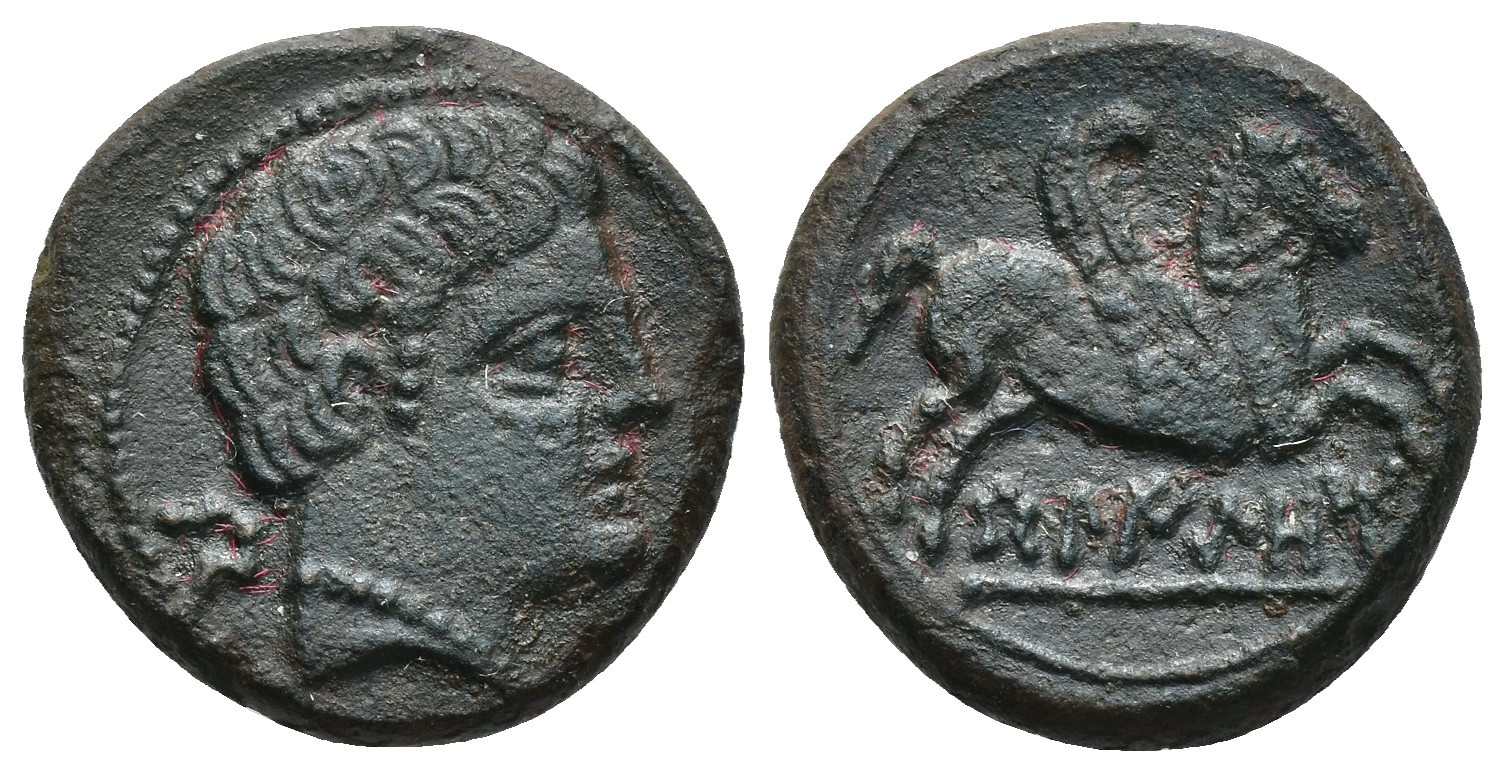 HISPANIA ANTIGUA. BELIKIOM. Mitad. A/ Cabeza masculina con collar a der. R/ Pegaso volando a der., debajo sobre línea BeLIKiOM. AE 6,55 g. 20 mm. I-245; ACIP-1435. Pátina oscura. EBC-MBC+. Muy escasa.