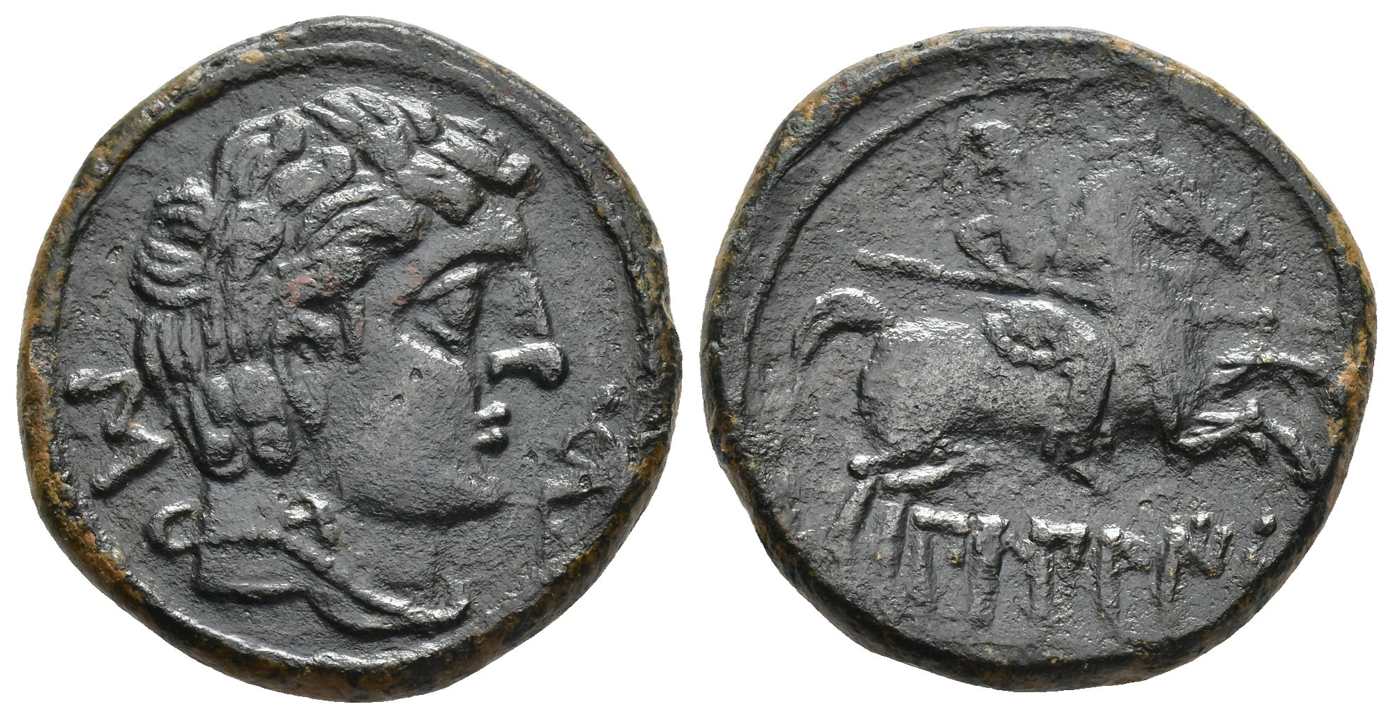 HISPANIA ANTIGUA. BILBILIS. Unidad. A/ Cabeza masculina a der. con torques, delante delfín, detrás S. R/ Jinete lancero, debajo BiLBiLIS. AE 13,55 g. 27 mm. I-254. ACIP-1571. Pátina oscura. MBC+/MBC-. Rara.