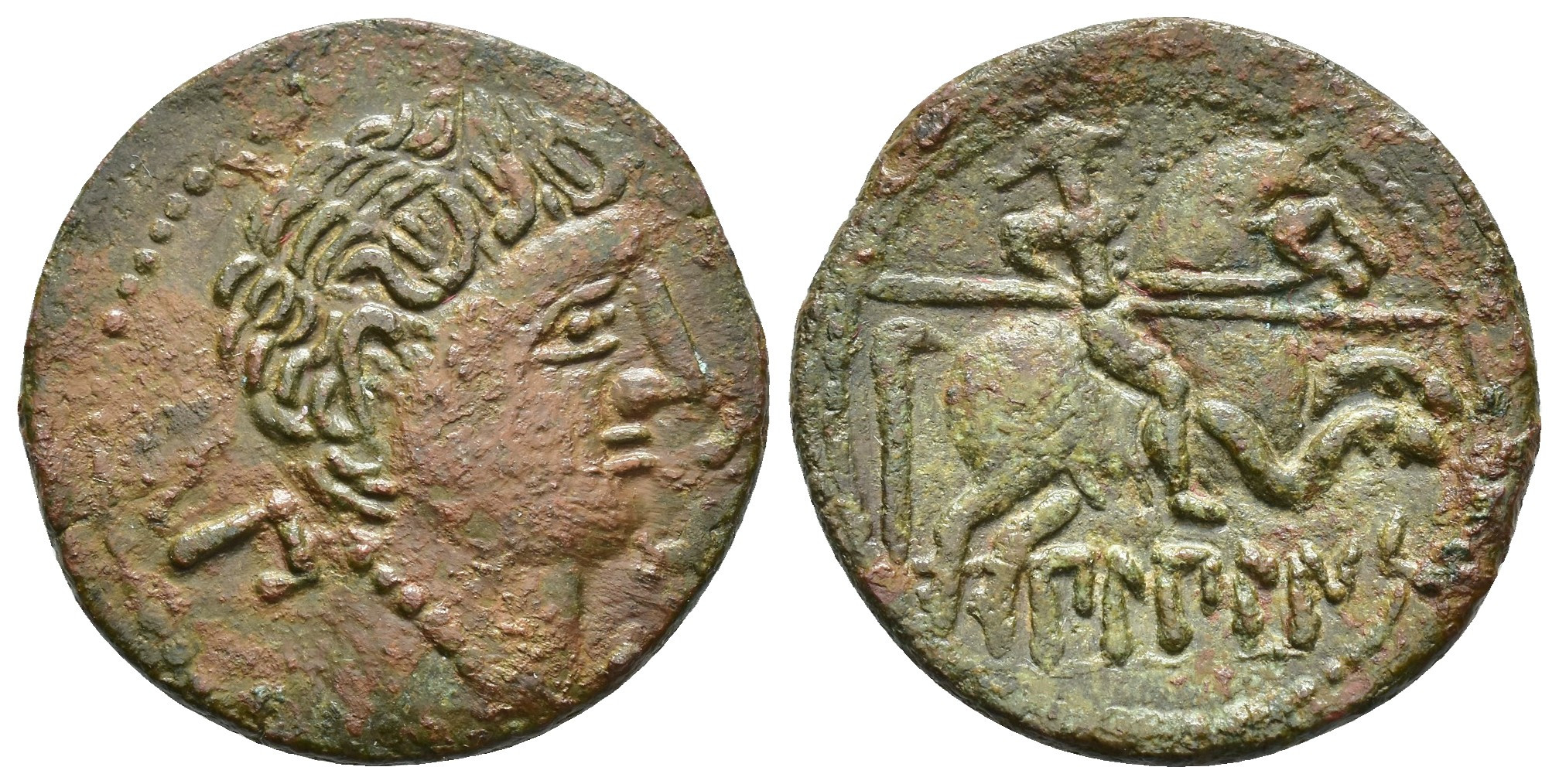 HISPANIA ANTIGUA. BILBILIS. Unidad. A/ Cabeza masculina con collar a der., delante delfín, detrás Bi. R/ Jinete con lanza a der., debajo sobre línea BiLBiLIS. AE 8,06 g. 26,8 mm. I-263; ACIP-1573. Pátina verde y rojiza irregular. EBC-. Muy escasa.