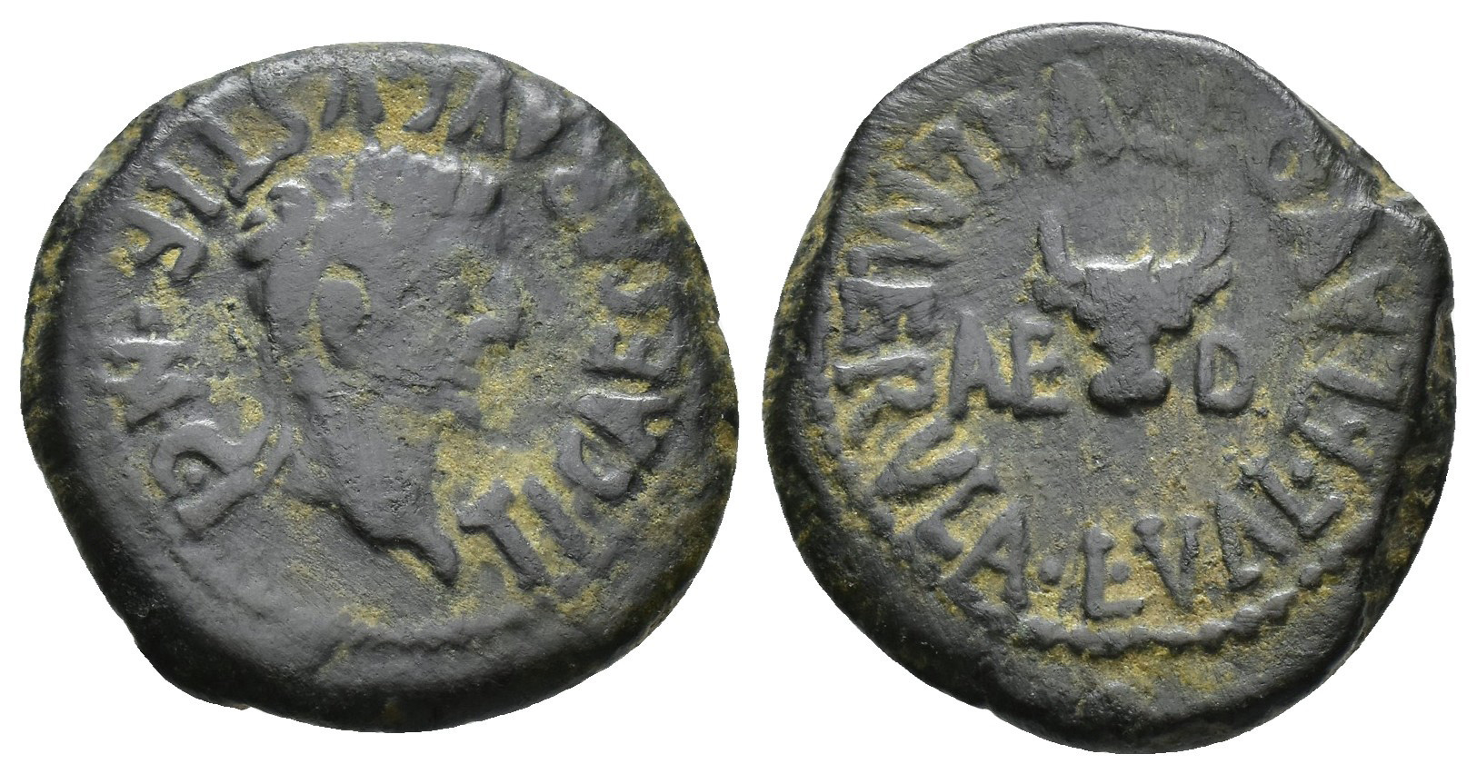 HISPANIA ANTIGUA. CALAGURRIS. Tiberio. Semis. A/ Cabeza laureada a der.; TI CAESAR AVGVSTI F M C I. R/ Cabeza frontal de toro, en campo AE-D; L VAL FLAVO T VAL MERVLA. AE 7,20 g. 22,3 mm. I-431; APRH-449; ACIP-3129; CC-5057, mismo ejemplar. Pátina verde oscuro. BC+/MBC-.