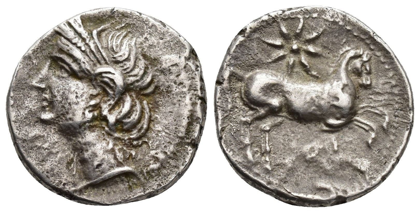 HISPANIA ANTIGUA. EMISIONES HISPANO-CARTAGINESAS. Siclo. A/ Cabeza de Tanit con tocado vegetal a izq. R/ Caballo encabritado a der., encima estrella. AR 6,47 g. 21,4 mm. I-493; ACIP-565. Superficies erosionadas. MBC. Escasa.
