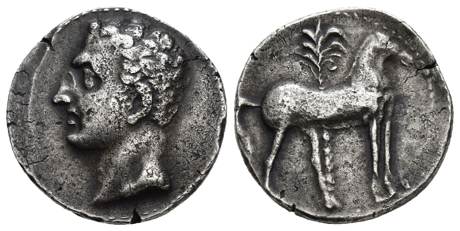 HISPANIA ANTIGUA. EMISIONES HISPANO-CARTAGINESAS. Siclo. A/ Cabeza masculina a izq. R/ Caballo parado delante de palmera. AR 7,08 g. 21,5 mm. I-538; ACIP-614. Golpecito en anv. y pequeñas grietas. MBC. Escasa.