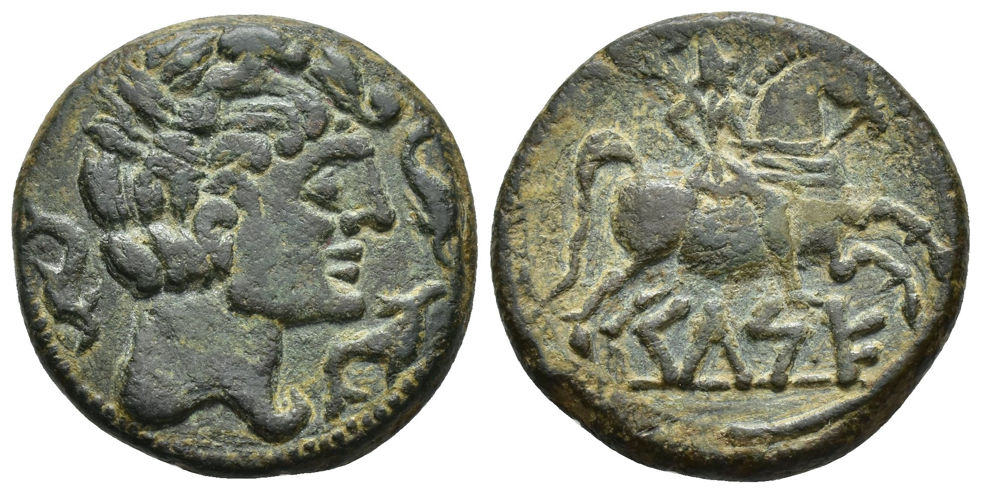 HISPANIA ANTIGUA. KELSE. Unidad. A/ Cabeza masculina con manto a der., alrededor 3 delfines. R/ Jinete con palma a der., debajo, sobre línea, KeLSE. AE 13,03 g. 26,1 mm. I-771; ACIP-1480. Pátina verde. MBC+/MBC. Muy escasa.