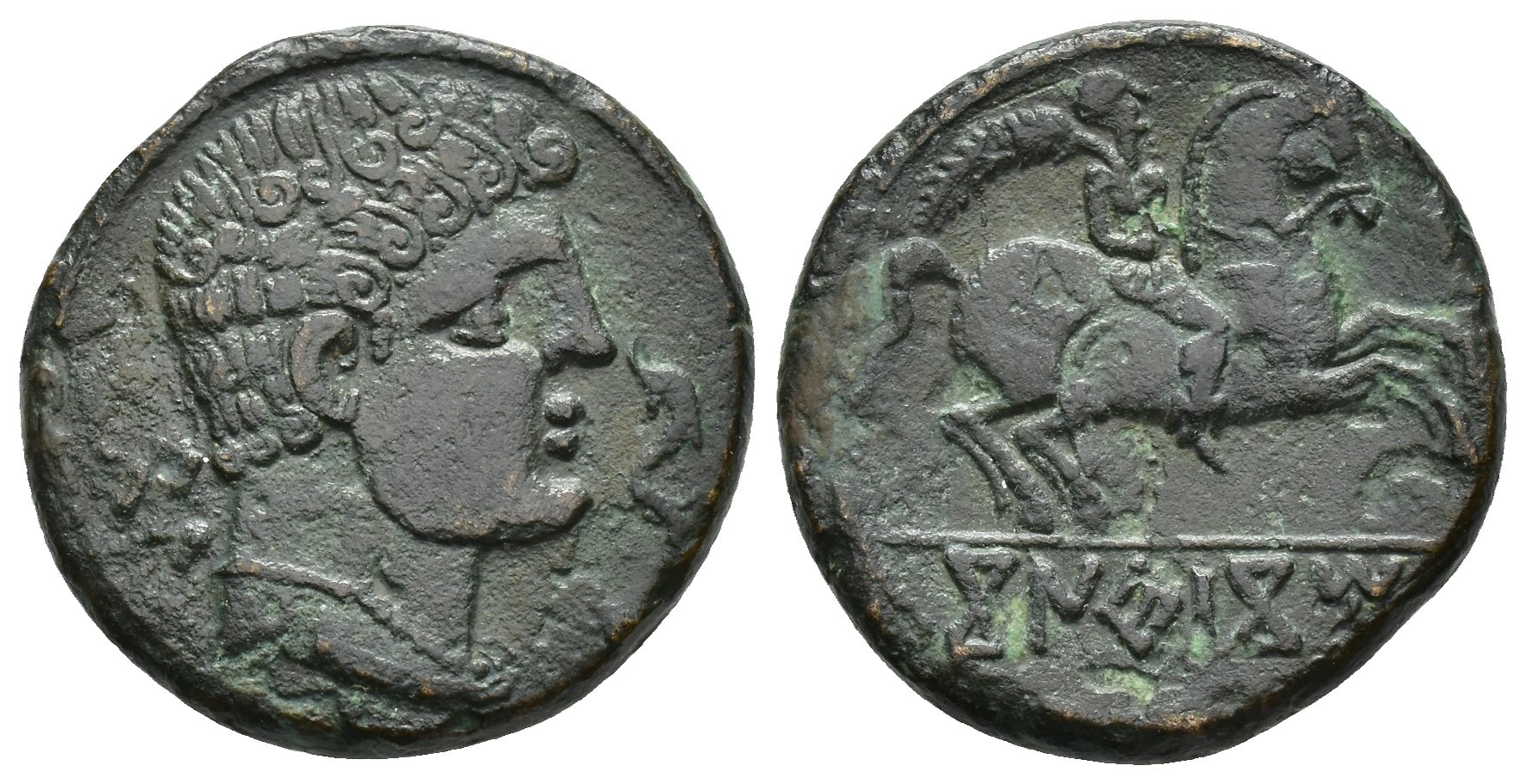 HISPANIA ANTIGUA. KONTERBIA BELAISKA. Unidad. A/ Cabeza masculina con collar a der., delante delfín, detrás BeL. R/ Jinete con palma a der., exergo KoNTeBaKoM. AE 9,24 g. 23,4 mm. I-861; ACIP-1594. Pequeñas erosiones. MBC+. Escasa.