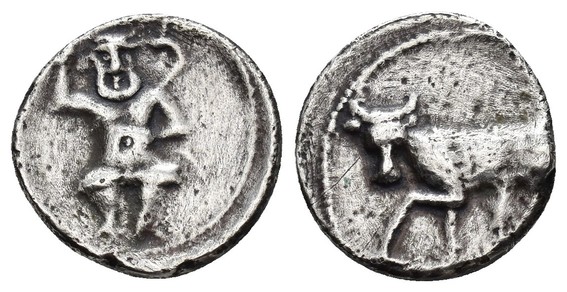 HISPANIA ANTIGUA. EBUSUS. Hemidracma. A/ Bes de frente. R/ Toro avanzando a izq. AR 2,04 g. 14,8 mm. I-915; ACIP-717. Campos repasados. MBC-. Escasa.