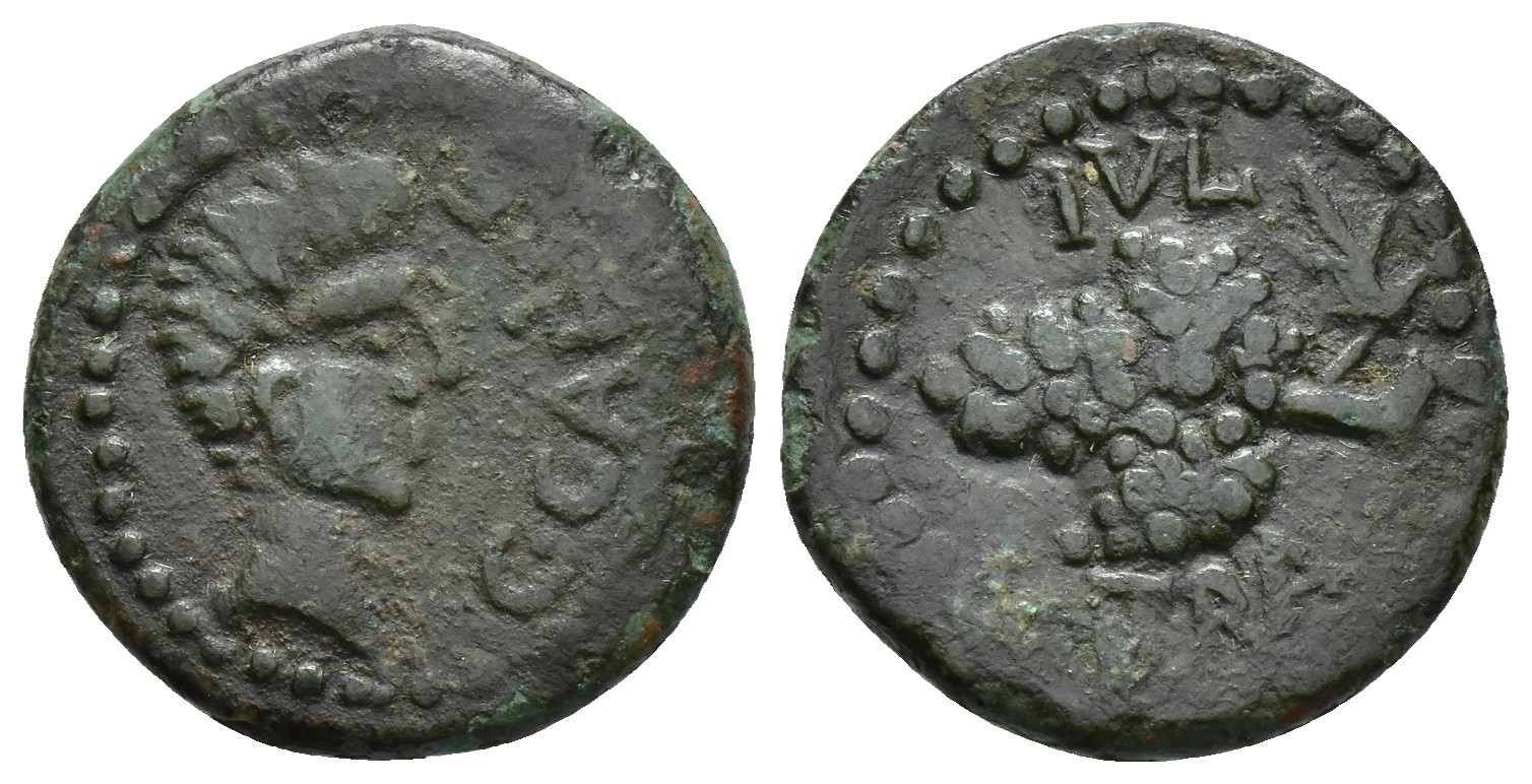 HISPANIA ANTIGUA. IULIA TRADUCTA. Augusto. Semis. A/ Cabeza de Cayo a der.; C CAES F. R/ Racimo de uvas a izq.; IVL-TRA. AE 4,56 g. 20 mm. I-1615; APRH-101b; ACIP-3345a; CC-4142, mismo ejemplar. Pátina oscura. MBC-/MBC.