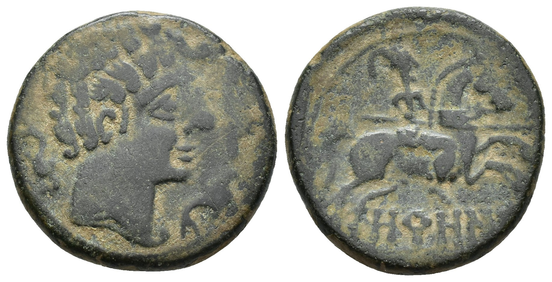 HISPANIA ANTIGUA. OROSIS. Unidad. A/ Cabeza masculina a der., alrededor 3 delfines. R/ Jinete con lanza a der., debajo OROSI(S). AE 10,44 g. 25,1 mm. I-1907; ACIP-1509. Pátina verde oscuro. MBC-. Muy escasa.