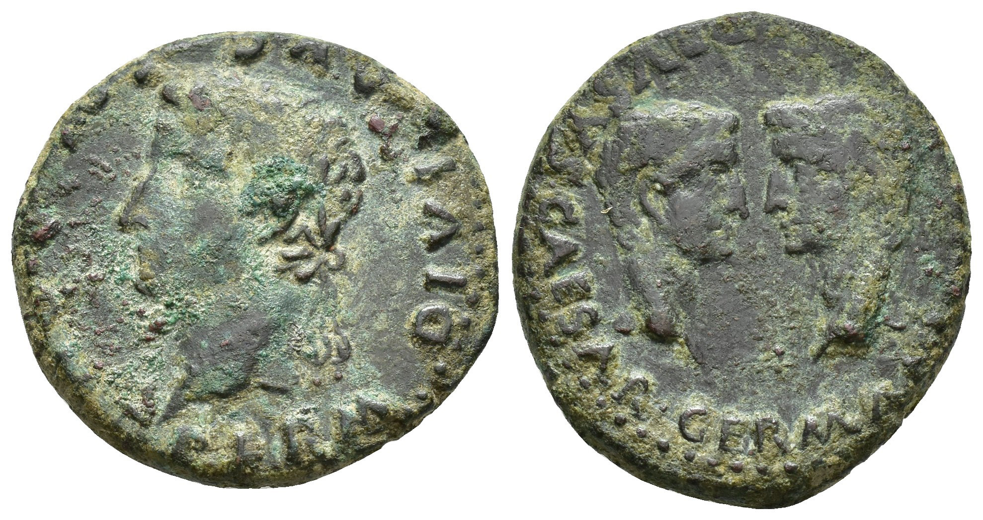 HISPANIA ANTIGUA. COLONIA ROMULA. Tiberio. As. A/ Cabeza laureada a izq.; PERM DIVI AVG (COL ROM). R/ Cabezas afrontadas de Germánico y Druso; GERMANI(CVS CAESAR) DRVSVS CAESAR. AE 13,28 g. 28 mm. I-2016; APRH-74; ACIP-3361; CC-4089, mismo ejemplar. Pátina verde con concreciones. MBC/MBC-. Muy escasa.