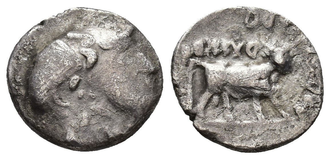 HISPANIA ANTIGUA. ARSE. Dracma. A/ Cabeza femenina con casco a der. R/ Toro androsopo a der.; ARSEETaR-ARSBiKiTeEKiAR, poco visible. AR 2,71 g. 15,2 mm. I-2040; ACIP-1939. Acuñación floja en anv. BC+/MBC-.