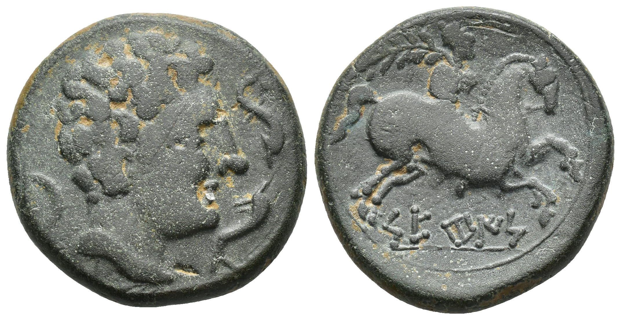 HISPANIA ANTIGUA. SETEISKEN. Unidad. A/ Cabeza masculina a der., delante dos delfines, detrás creciente. R/ Jinete con palma a der., debajo sobre línea SETeIS. I-2214; ACIP-1459. AE 17,19 g. 28,1 mm. Pátina oscura. MBC-. Rara.