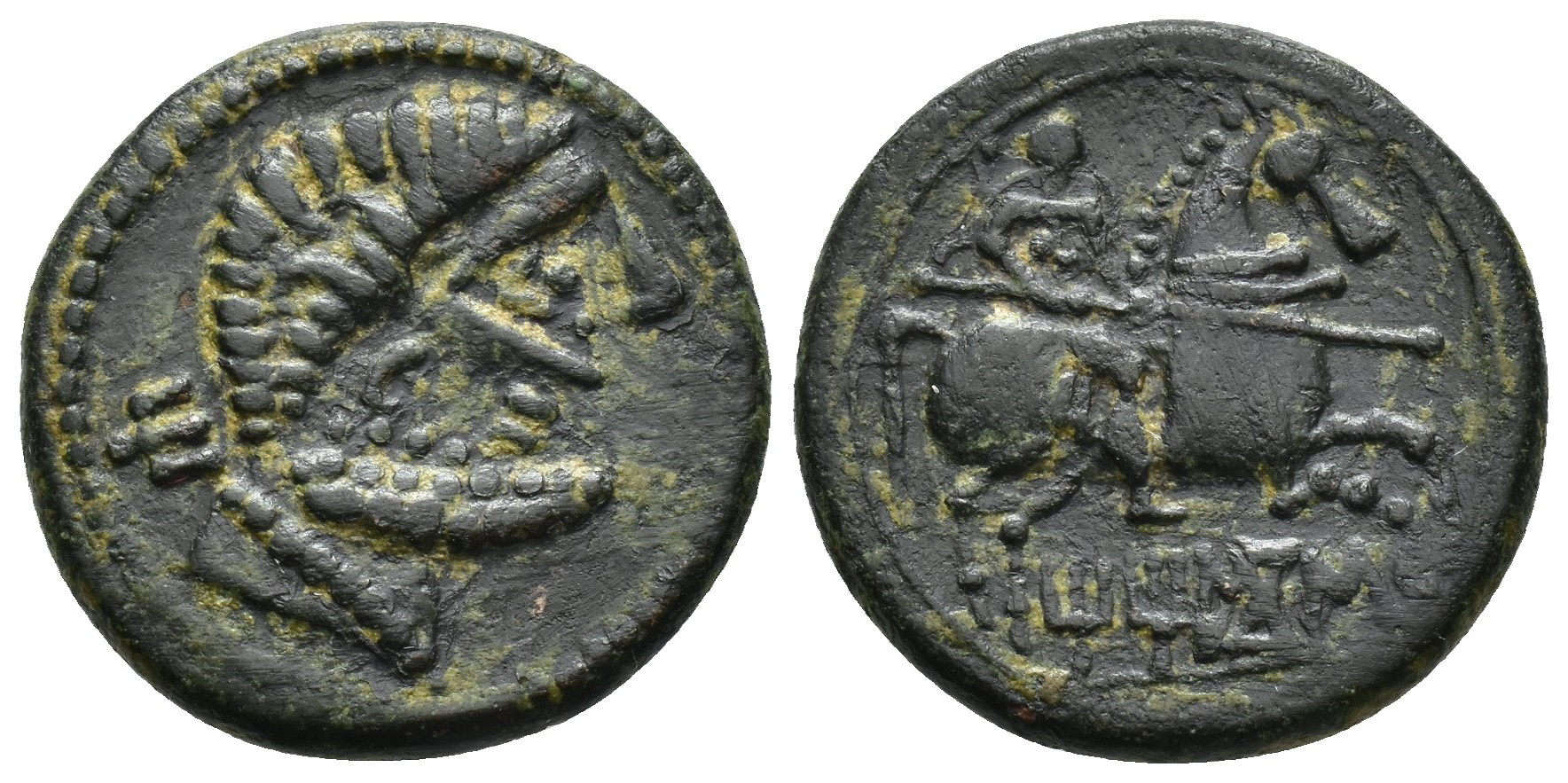 HISPANIA ANTIGUA. TITIAKOS. Unidad. A/ Cabeza masculina con collar a der., detrás Ti. R/ Jinete lancero a der., debajo sobre línea TiTiAKoS. AE 8,3 g. 23,7 mm. I-2392; ACIP-1898. Pátina oscura, MBC+. Escasa.