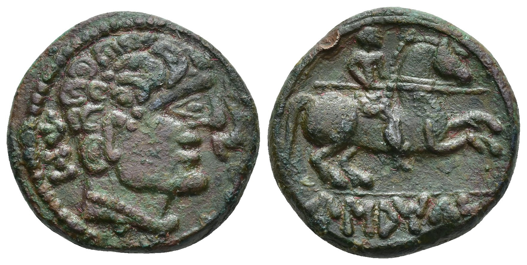 HISPANIA ANTIGUA. USAMUS. Unidad. A/ Cabeza masculina con collar a der., delante delfín, detrás US. R/ Jinete lancero a der., exergo USAMUS. AE 10,38 g. 22,2 mm. I-2505; ACIP-1925. Pátina verde oscuro. MBC+. Muy rara.