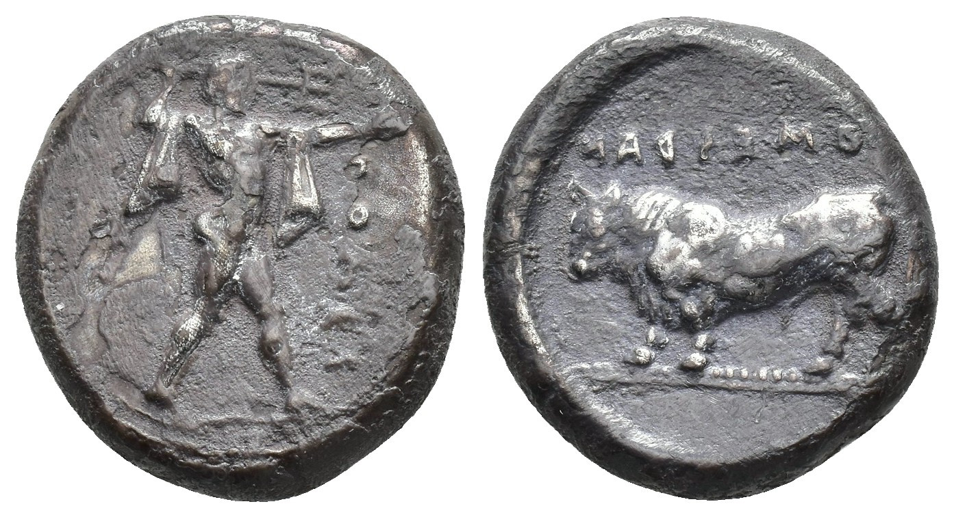 GRECIA ANTIGUA. LUCANIA. Posidonia. Estátera (c. 480-400 a.C.). A/ Poseidón a der. blandiendo el tridente; POSEI retrógrada. R/ Toro a izq., encima POSEIDAN retrógrada. AR 8,01 g. 19,5 mm. COP-1285; SBG-424. Concreciones MBC.