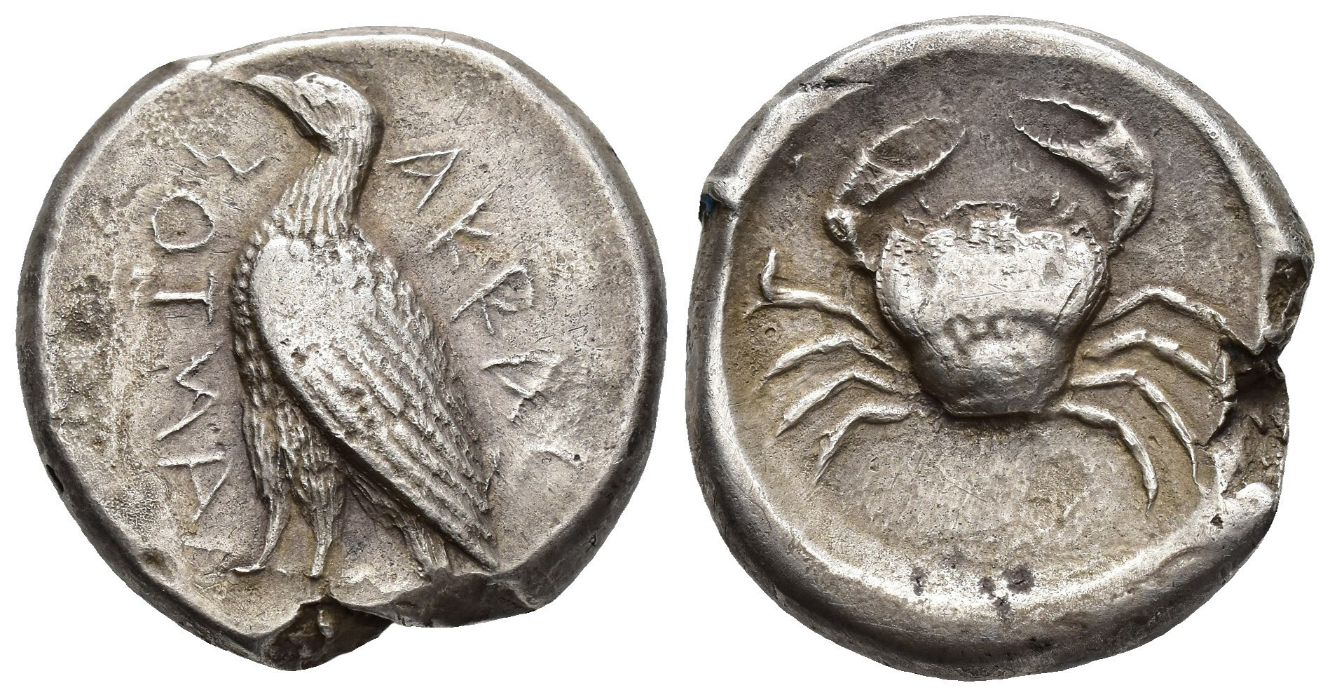 GRECIA ANTIGUA. SICILIA. Akragas. Tetradracma (ante. 413 a.C.). A/ Águila a izq.; AKRAGANTOS (retrógrada). R/ Cangrejo. AR 17,12 g. 26 mm. COP-41; SBG-408. Defecto de cospel al borde. Ligeras erosiones. MBC. Muy escasa.