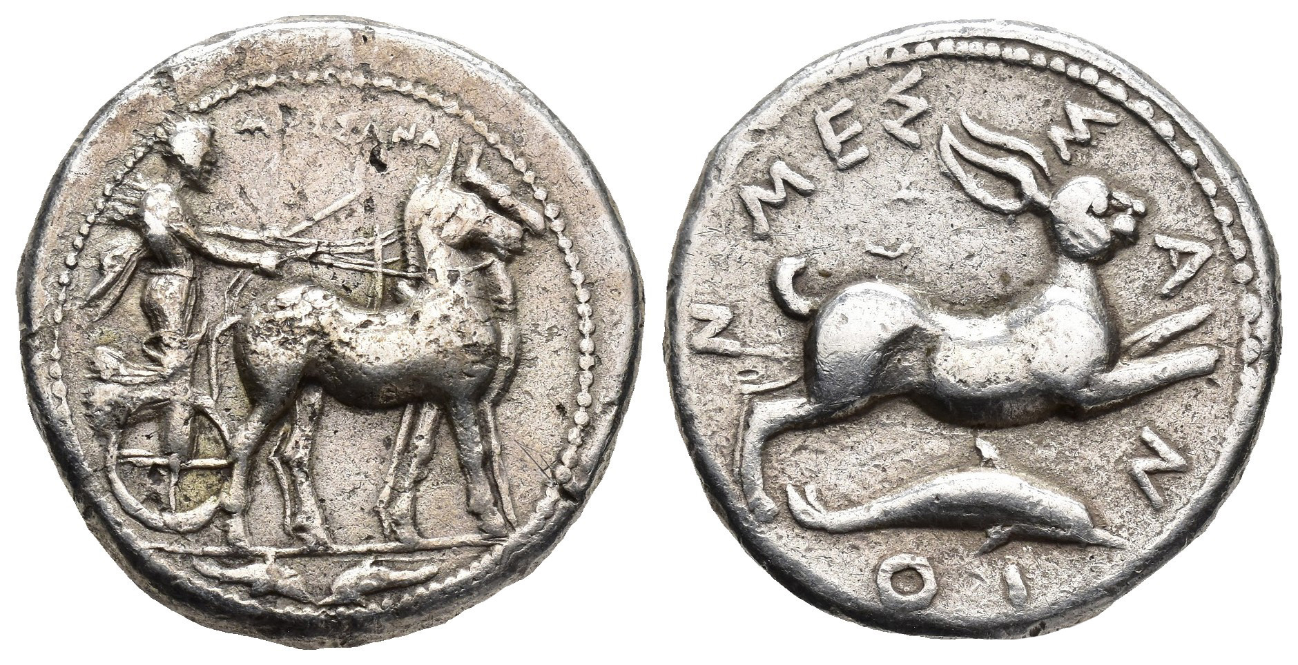 GRECIA ANTIGUA. SICILIA. Messana. Tetradracma (c. 420-413 a.C.). A/ Biga de mulas a der. conducida por la ninfa Messane, en exergo dos delfines afrontados, encima MESSANA. R/ Liebre corriendo a der., debajo delfín; MESSANION. AR 15,61 g. 25,2 mm. COP-400 var.; SBG-851. Pequeñas erosiones. MBC-/MBC. Escasa.