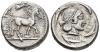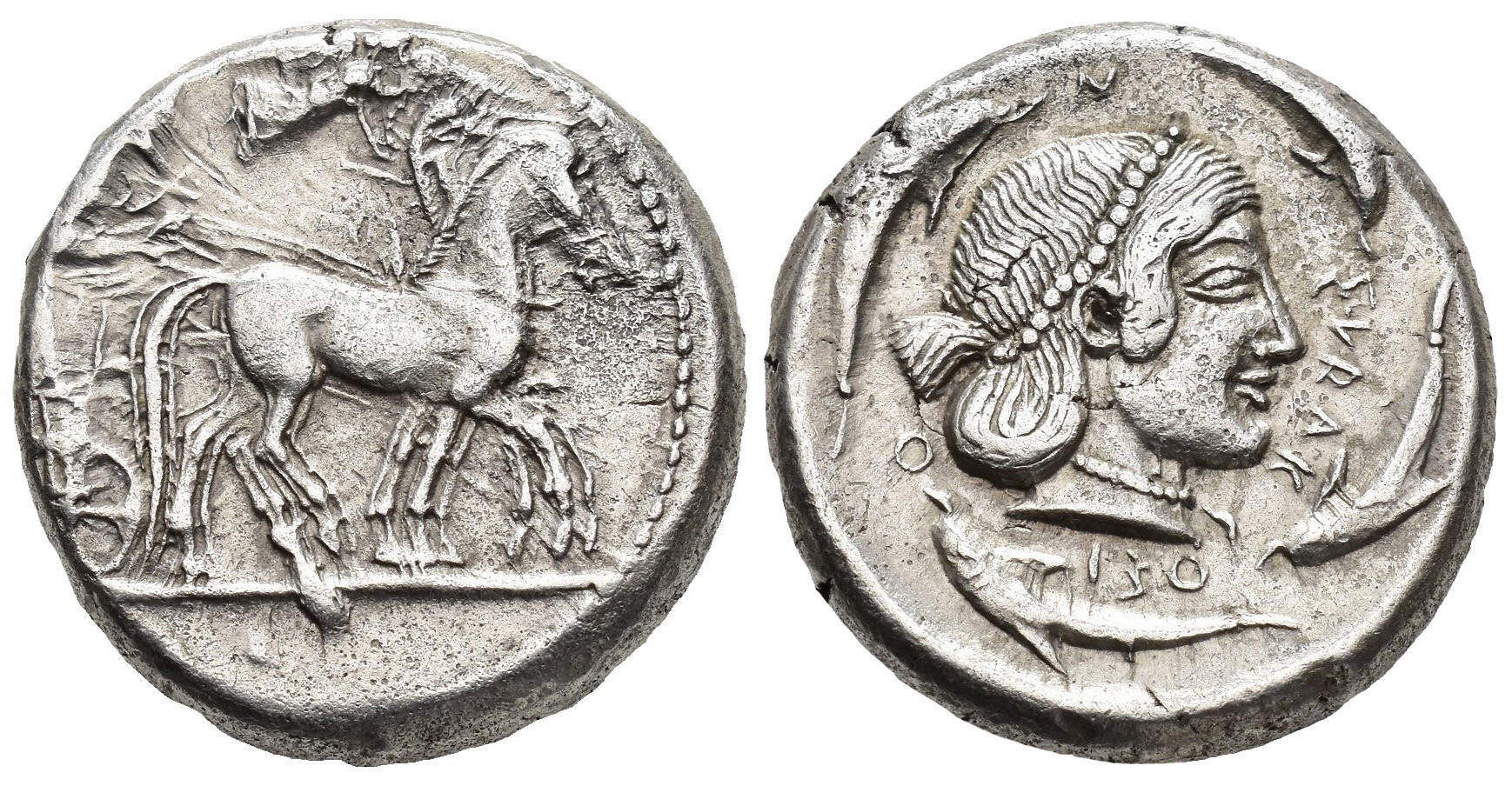 GRECIA ANTIGUA. SICILIA. Siracusa. Tetradracma (485-456 a.C.). A/ Biga a der., encima Niké. R/ Cabeza de Aretusa a der. rodeada de delfines; SURAKOSION. AR 17,15 g. 23,8 mm. COP-620 ss.; SBG-913. MBC. Escasa.