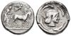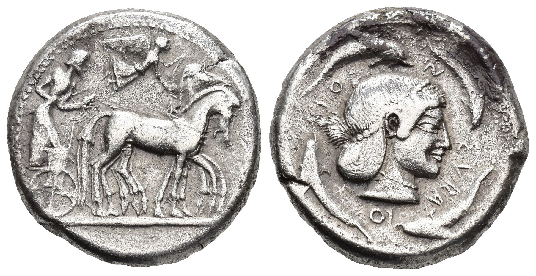 GRECIA ANTIGUA. SICILIA. Siracusa. Tetradracma (485-465 a.C.). A/ Biga a der., encima Niké. R/ Cabeza de Aretusa a der., alrededor delfines; SURAKOSION. AR 17,13 g. 24,3 mm. COP-620 ss.; SBG-913. Leves oxidaciones. MBC-/MBC. Escasa.