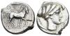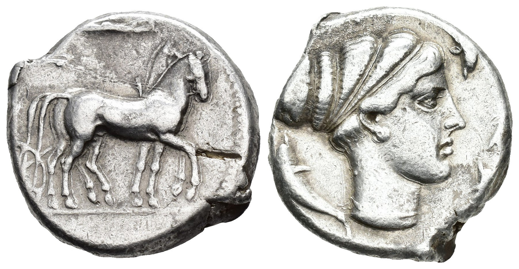 GRECIA ANTIGUA. SICILIA. Siracusa. Tetradracma (segunda democracia, 425-s. IV a.C.). A/ Biga a der., encima Niké. R/ Cabeza de Aretusa a der., alrededor delfines. AR 17,48 g. 25,2 mm. COP-660 var.; SBG-932. Raya en anv. MBC. Escasa.