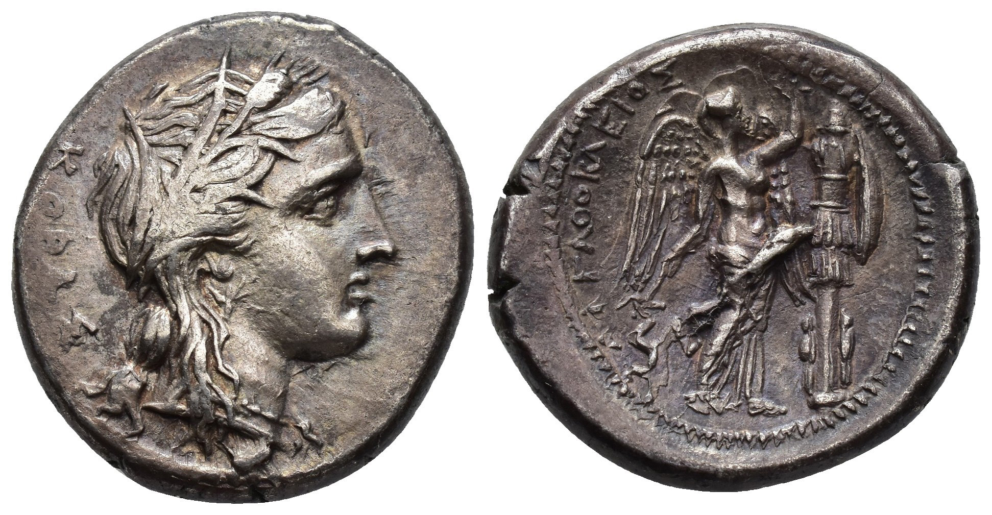 GRECIA ANTIGUA. SICILIA. Siracusa. Tetradracma. Agatocles (c. 310-304 a.C.). A/ Cabeza de Perséfone con tocado vegetal a der., detrás KORAS. R/ Niké elaborando trofeo a der., detrás trisqueles y AGATOKLEIOS. AR 16,81 g. 26,8 mm. COP-766; SBG-972. MBC+/EBC-. Escasa.