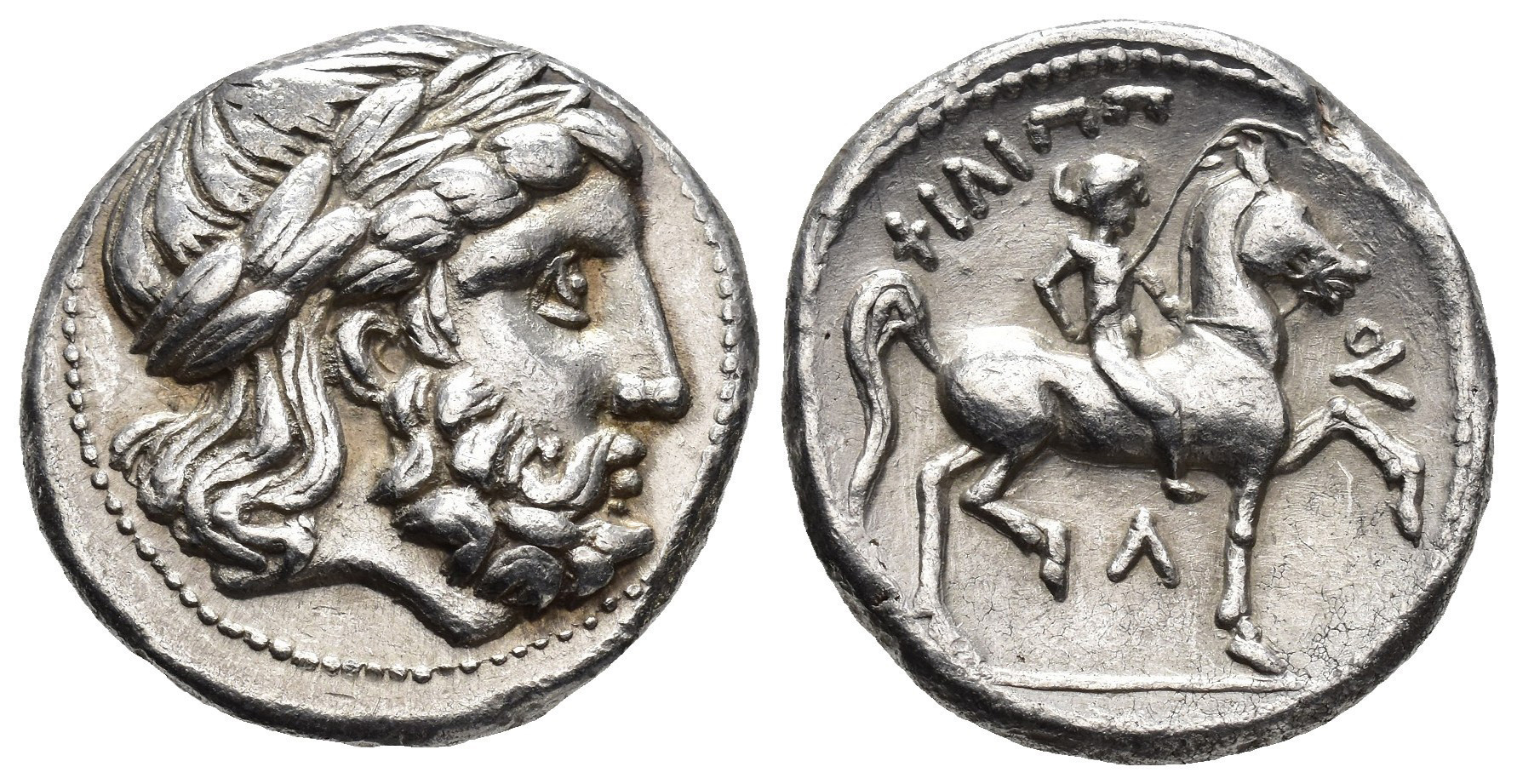 GRECIA ANTIGUA. MACEDONIA. Filipo II. Tetradracma. A/ Cabeza de Zeus laureada a der. R/ Jinete con palma a der., debajo lambda; FILIPPOU. AR 14,11 g. 24 mm. COP-no; Le Rider- EBC-.
