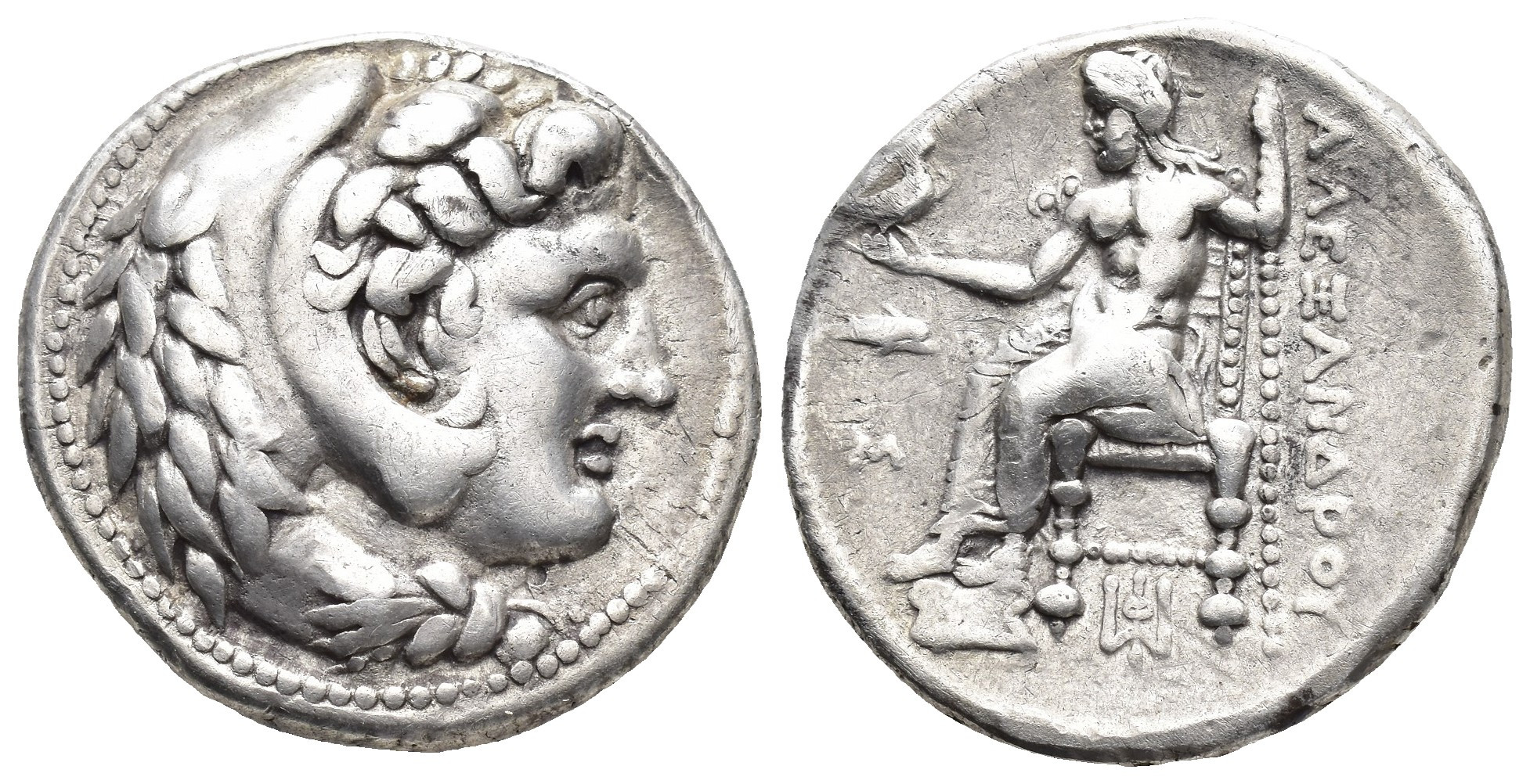 GRECIA ANTIGUA. MACEDONIA. Alejandro III. Babilonia. Tetradracma (c. 325-323 a.C.). A/ Cabeza de Alejandro/Herakles con leonté a der. R/ Zeus entronizado a izq.,debajo del trono monograma, delante delfín y M. AR 16,99 g. 25,5 mm. Price-3617. MBC/MBC-.