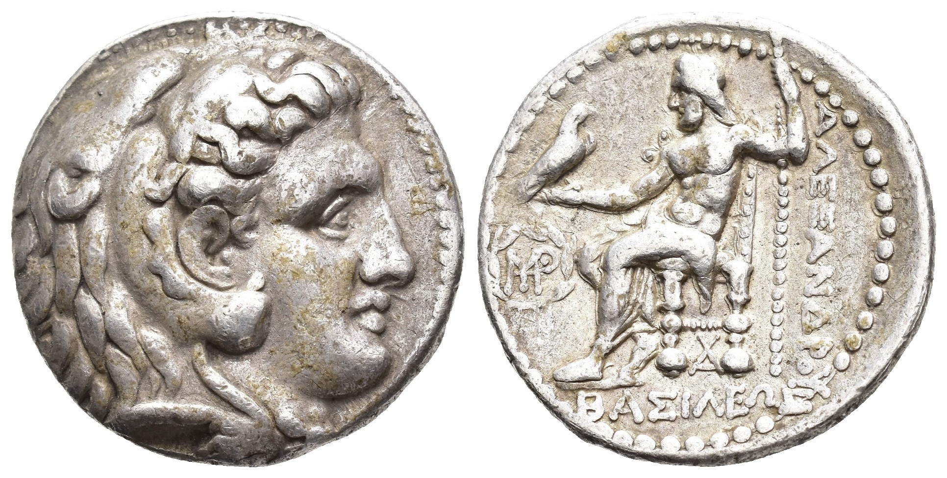 GRECIA ANTIGUA. MACEDONIA. A nombre de Alejandro III. Babilonia. Tetradracma (317-311 a.C.). A/ Cabeza de Alejandro/Herakles con leonté a der. R/ Zeus entronizado a izq., debajo del trono monograma, delante monograma dentro de láurea. AR 16,86 g. 26,4 mm. Price-3722. MBC.