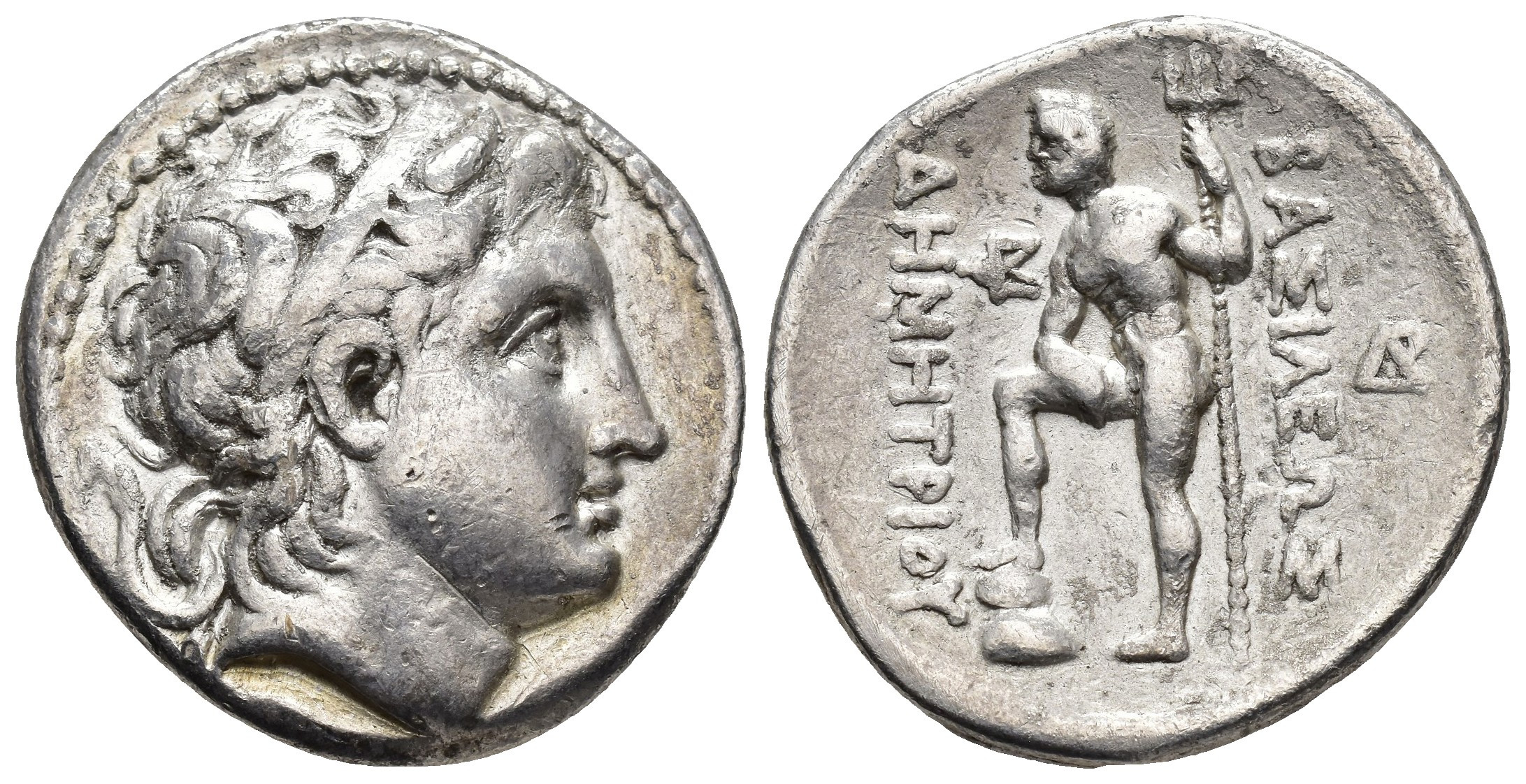 GRECIA ANTIGUA. MACEDONIA. Demetrio. Anfípolis (?). Tetradracma (post. 291 a.C.). A/ Cabeza diademada a der. R/ Poseidón a izq. con tridente y pie sobre roca, delante y a der. monograma; BASILEWS/DHMHTRIOU. AR 16,64 g. 30 mm. COP-1177 var. monograma. Pequeñas marcas. MBC.