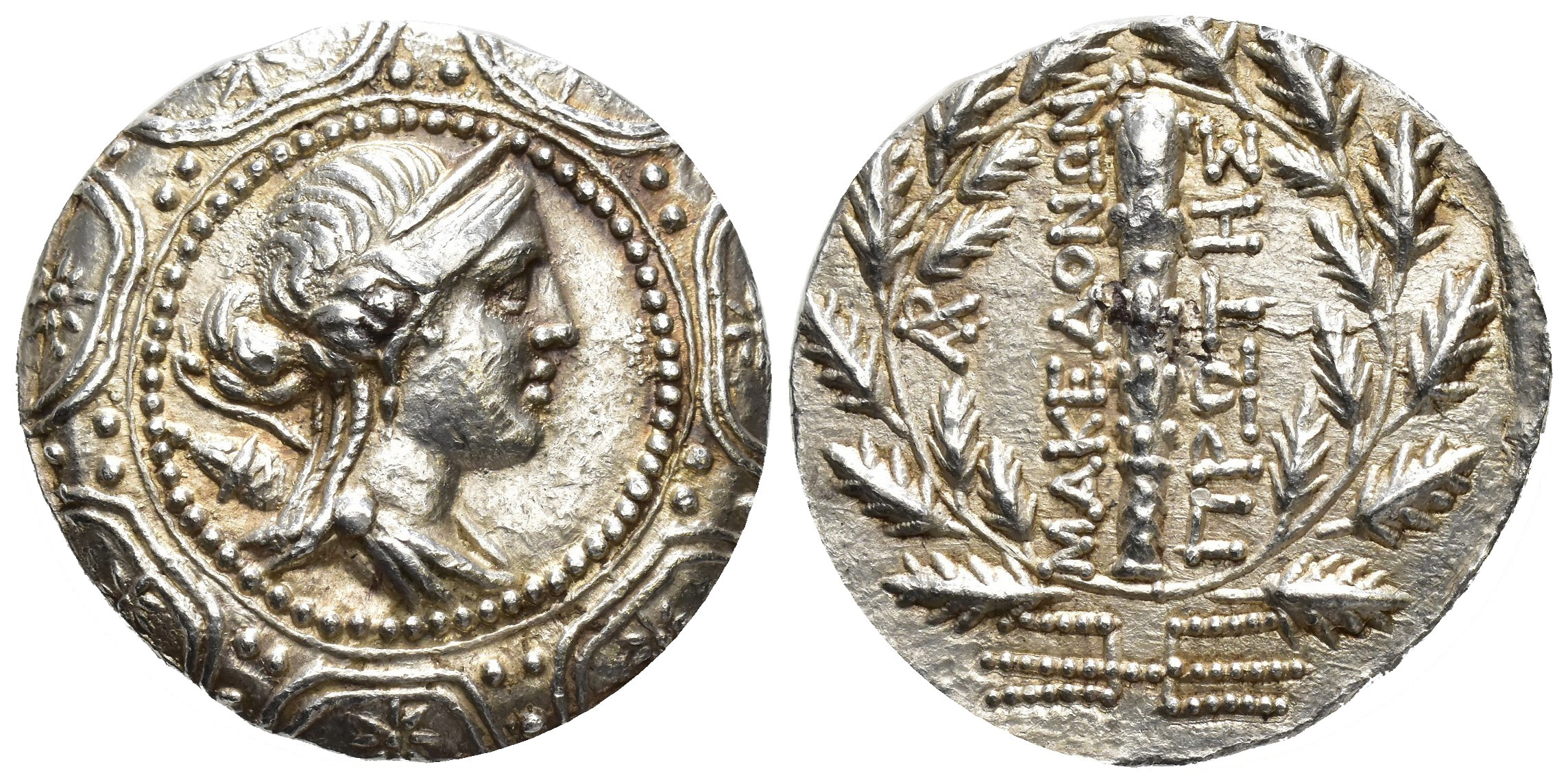 GRECIA ANTIGUA. MACEDONIA. Dominio romano. Tetradracma (158-150 a.C.). A/ Cabeza de Ártemis a der. con arco y carcaj dentro de escudo macedonio. R/ Corona de roble con haz de rayos rodeando clava, encima monograma; MAKEDONWN/PROTHS. AR 16,84 g. 30,3 mm. COP-1310 var. monograma. EBC-/EBC.
