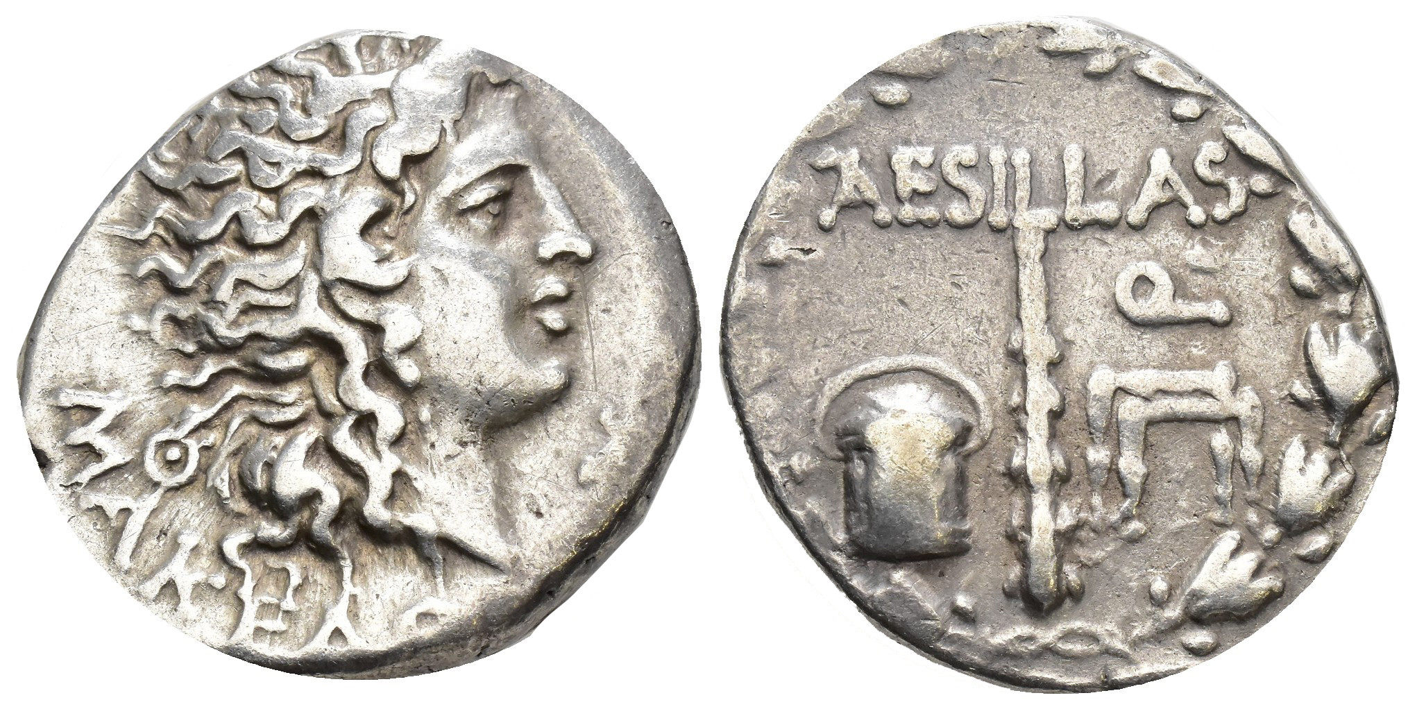 GRECIA ANTIGUA. MACEDONIA. Aesilas. Tetradracma (93-92 a.C.). A/ Cabeza de Alejandro con cuernos de Amón a der., detrás Q; MAKEDO(NW)N. R/ Clava, cofre y silla; AESILLAS/Q. AR 16,97 g. 26,3 mm. COP-1330. MBC.