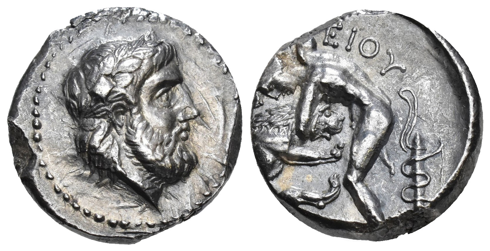 GRECIA ANTIGUA. PEONIA. Likkeios. Tetradracma (c. 359-340 a.C.). A/ Cabeza de Zeus laureada a der. R/ Herakles a izq. luchando contra león, detrás carcaj, encima (LUK)EIOY. AR 12,56 g. 22,4 mm. SBG-1518. Defectos de cospel. EBC.
