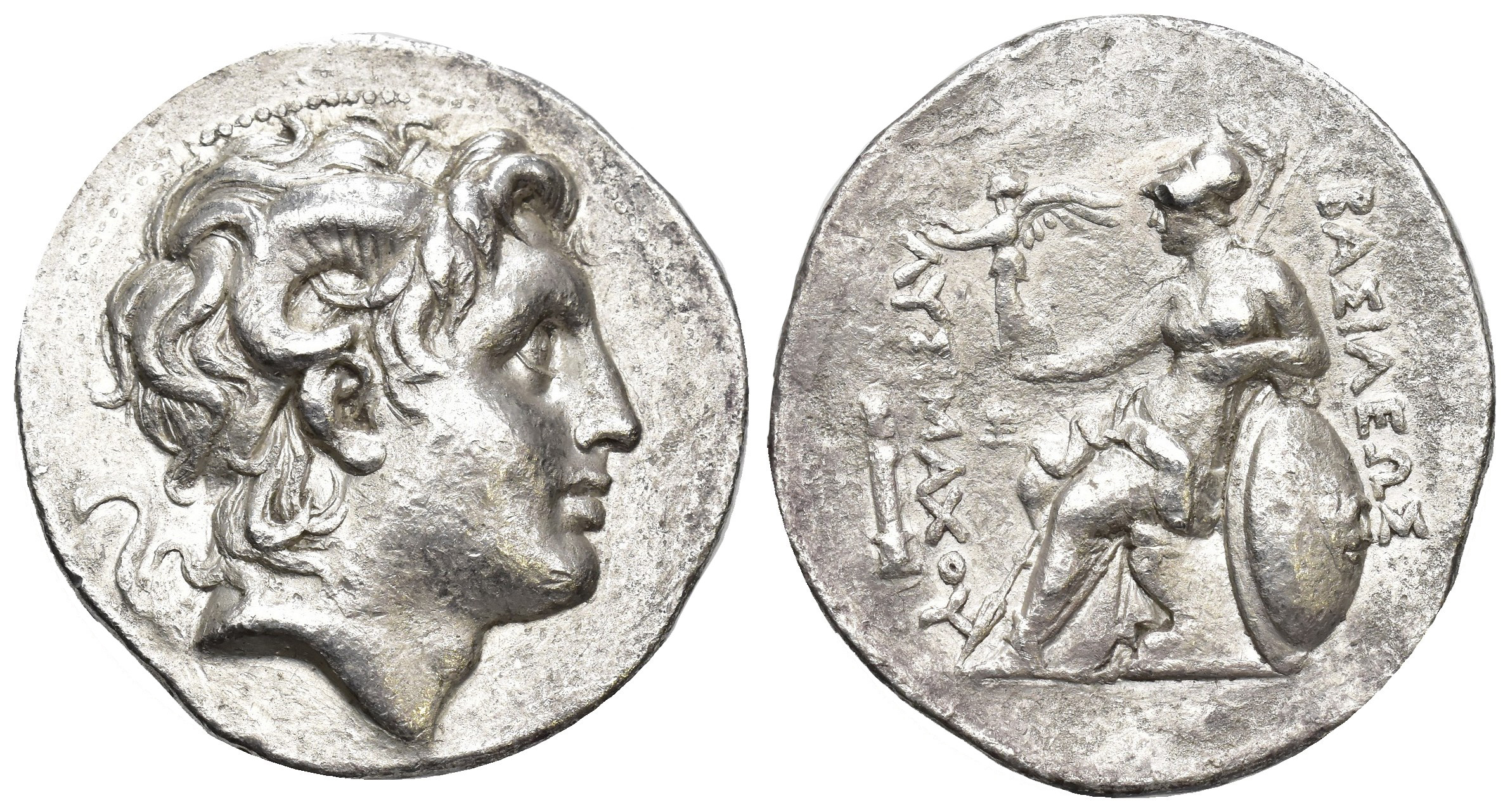 GRECIA ANTIGUA. TRACIA. Pérgamo. Lisímaco. Tetradracma (c. 297-281 a.C.). A/ Cabeza de Alejandro diademada y con cuernos de Amón a der. R/ Atenea sentada a izq. con Niké, delante monograma, en campo a izq. herma; BASILEWS/LUSIMAXOU. AR 16,6 g. 33 mm. COP-1095. MBC+/MBC.