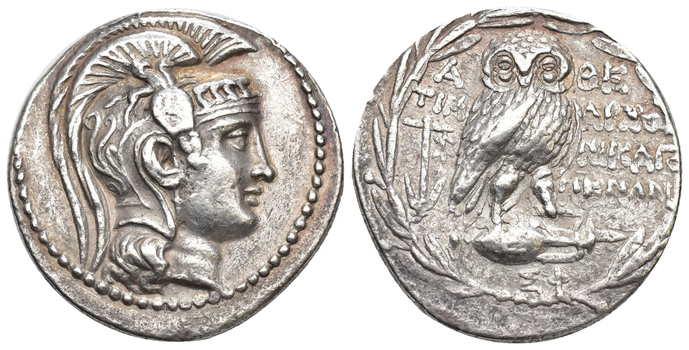 GRECIA ANTIGUA. ÁTICA. Tetradracma de nuevo estilo (136-135 a.C.). A/ Cabeza de Atenea a der. R/ Lechuza sobre ánfora a der., detrás ancla y estrella; A-QE/TIM-ARXOU/NIKAG/(…). AR 16,8 g. 30,7 mm. COP-246 var. tercer magistrado. MBC+.