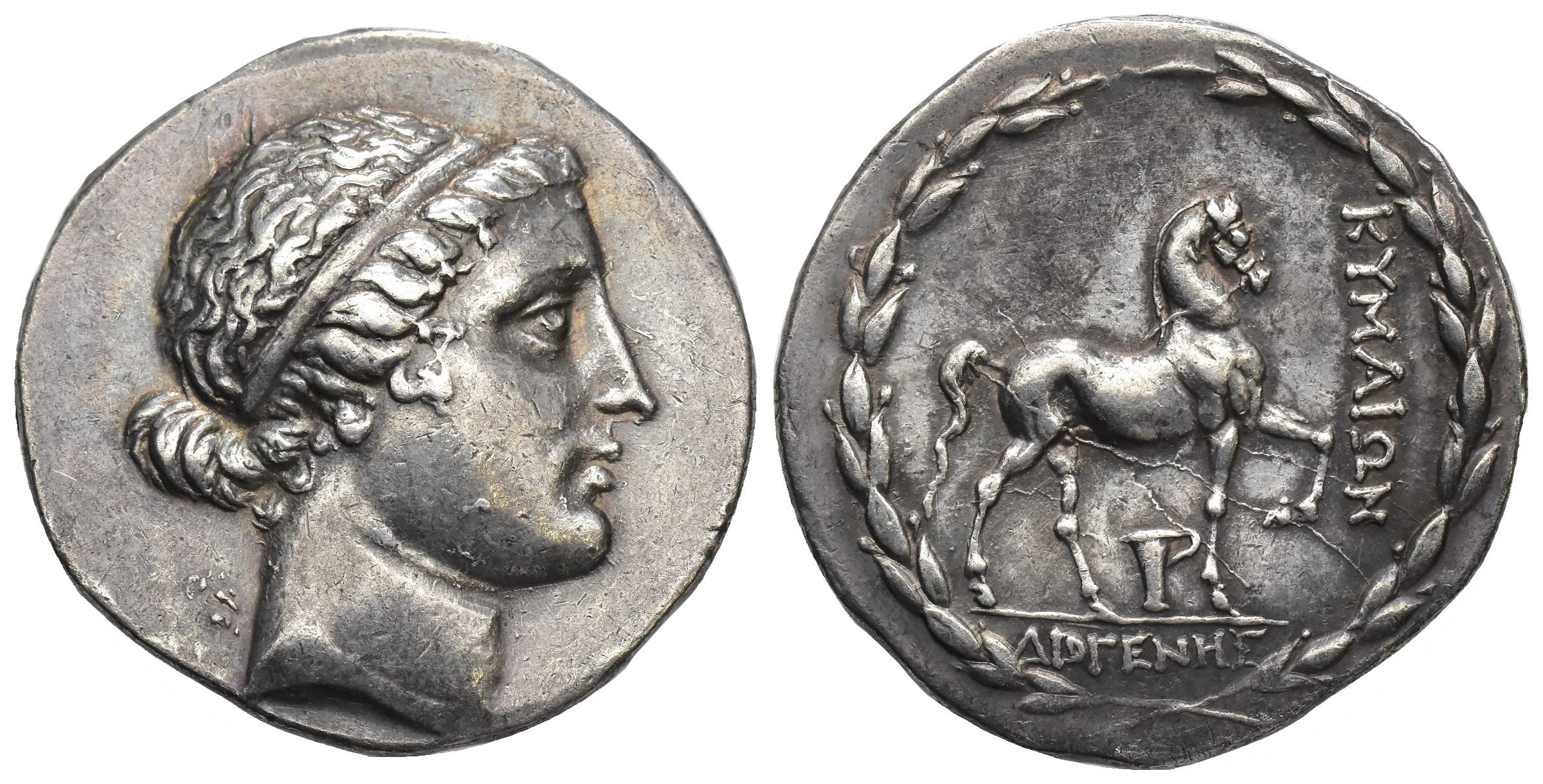 GRECIA ANTIGUA. EÓLIDA. Kyme. Tetradracma (post. 190 a.C.). A/ Cabeza diademada de la amazona Cyme a der. R/ Caballo a der. con pata izq. levantada, debajo jarra; KYMAIWN, exergo DIOGENHS, todo dentro de láurea. AR 16,73 g. 32,4 mm. COP-103, var. magistrado. MBC+.