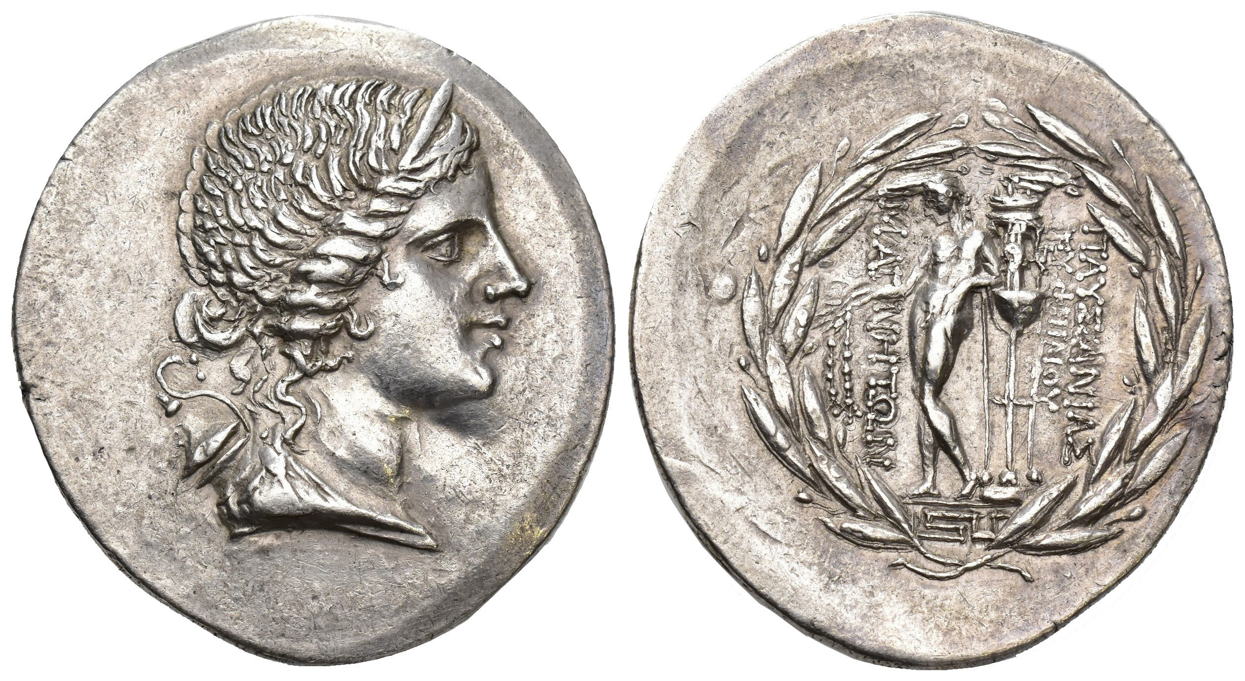 GRECIA ANTIGUA. JONIA. Magnesia ad Meandrum. Tetradracma (Post. 190 a.C.). A/ Cabeza de Ártemis a der. con estéfane, arco y carcaj. R/ Apolo a izq. con rama, apoyado en trípode sobre meandro geométrico; PAUSANIAS/EUFHMOU/MAGNHTWN. AR 16,9 g. 36,4 mm. COP-845 var. magistrado. MBC+.