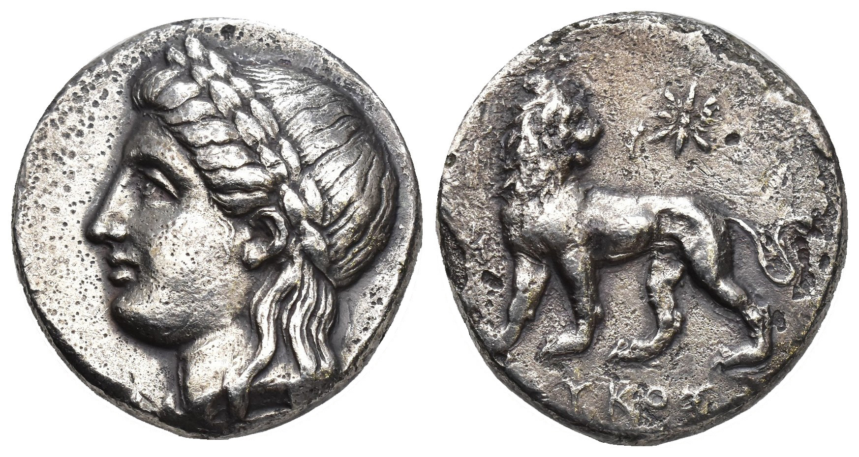 GRECIA ANTIGUA. JONIA. Mileto. Didracma (c. 300-250 a.C.). A/ Cabeza de Apolo laureada a izq. R/ León a izq. con cabeza vuelta, encima estrella, debajo (L)UKOS? AR 14,58 g. 24 mm. COP-986 var. magistrado. Oxidaciones limpiadas y pequeñas erosiones. MBC+. Rara.