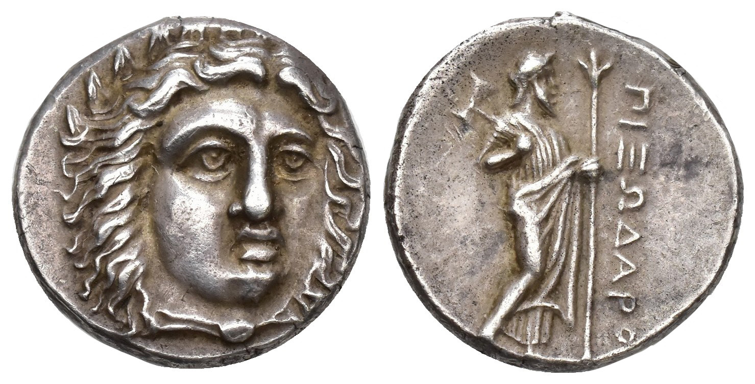 GRECIA ANTIGUA. CARIA. Sátrapas de Caria. Pixodaro. Didracma (340-334 a.C.). A/ Cabeza de Apolo semifrontal a der. R/ Zeus Labrandeus a der. con labryx y lanza; PIXWDARO(U). AR 6,99 g. 19,5 mm. COP-597. EBC-.