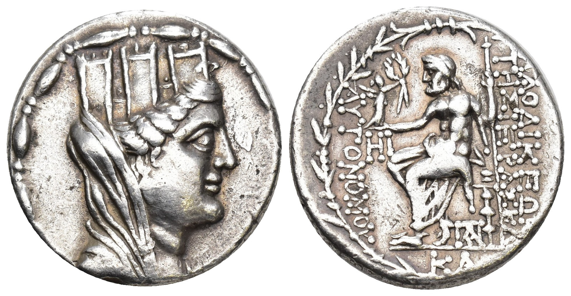 GRECIA ANTIGUA. SIRIA. Laodicea. Tetradracma (s. I a.C.-I d.C.). A/ Cabeza de Tyche velada y con corona mural a der. R/ Zeus sentado a izq. con Niké, delante HI, debajo del trono monograma, en exergo KA; LAODIKEWN/THS IERAS KAI/ AUTONOMOU. AR 15,25 g. 26,7 mm. COP-318 var. Hojita en anv. MBC.