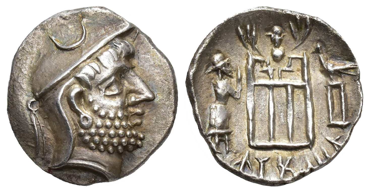 GRECIA ANTIGUA. REINO DE PERSIS. Darío I. Dracma (c. 150-100 a.C.). A/ Cabeza con kyrbasa, encima creciente a der. R/ Altar de fuego con símbolos zoroástricos, a izq. Ahuramazda, a der. pájaro sobre estandarte, alrededor ley. en arameo. AR 4,12 g. 19,7 mm. COP-294 var. EBC-/EBC. Muy escasa.