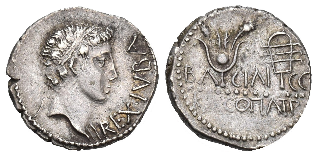 GRECIA ANTIGUA. MAURETANIA. Juba II. Denario (25-23 a.C.). A/ Cabeza diademada a der.; REX IVBA. R/ Tocado de Isis y sistro; BACILIC(A)/ KLEOPATP(A). AR 2,82 g. 17,2 mm. COP-549; MAA-99. MBC+.