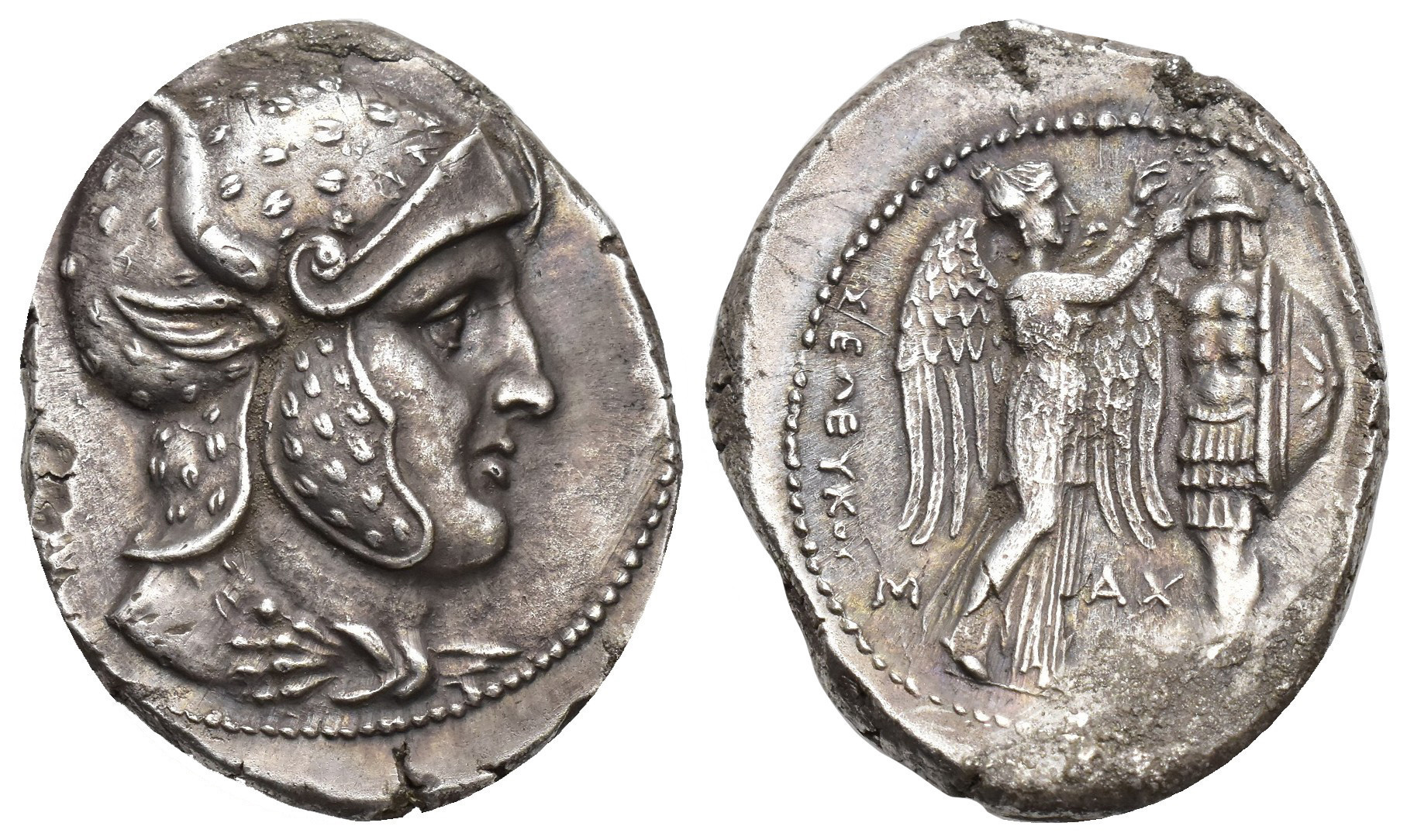 GRECIA ANTIGUA. REYES SELÉUCIDAS. Seleuco I. Susa. Tetradracma (301-295 a.C.). A/ Cabeza con casco, cuernos de Amón y leonté a der. R/ Niké elaborando trofeo a der., delante estrella y detrás SELEVKOU, en campo M-AX. AR 17,03 g. 29,2 mm. SelCoins-173.12. EBC/EBC-. Rara.