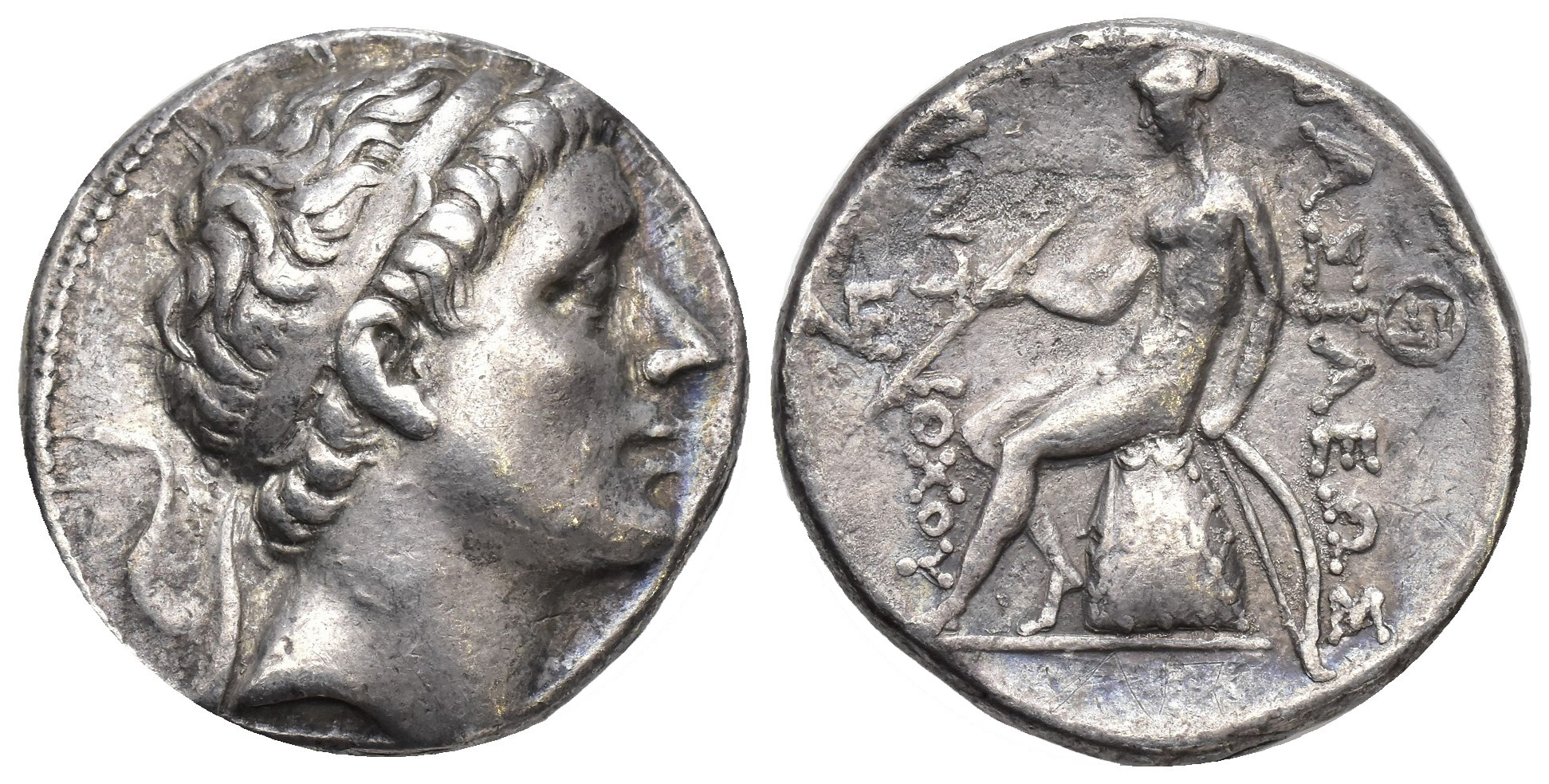 GRECIA ANTIGUA. REYES SELÉUCIDAS. ¿Antíoco III? Tetradracma. A/ Cabeza diademada a der. R/ Apolo a izq. sentado sobre ónfalos, a der. y a izq. monogramas. AR 16,64 g. 26,4 mm. Leves erosiones. MBC+/MBC.