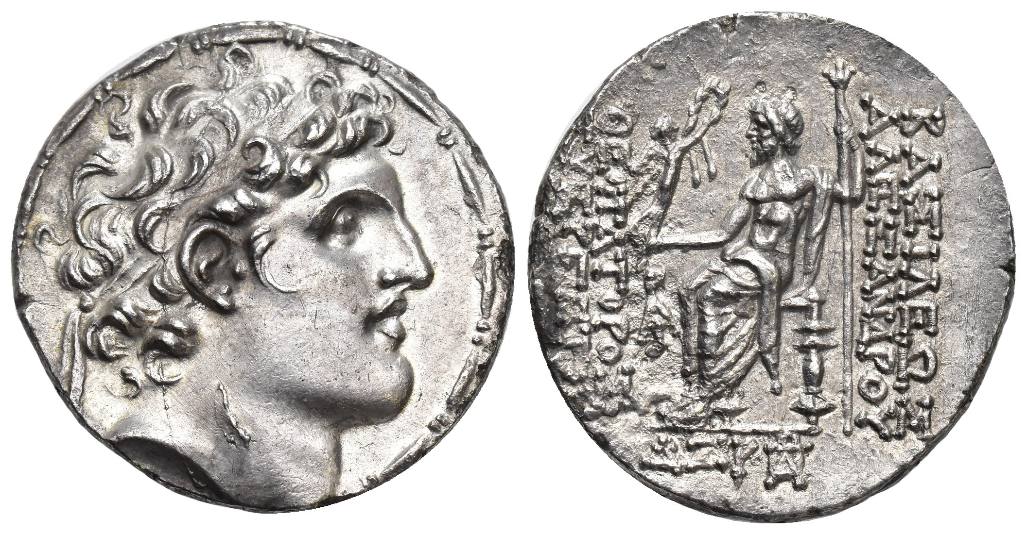 GRECIA ANTIGUA. REYES SELÉUCIDAS. Alejandro I Balas. Tetradracma (150-145 a.C.). A/ Cabeza diademada a der. R/ Zeus entronizada a izq., delante monograma, exergo DIP y monograma. AR 16,57 g. 28,9 mm. COP-251 var. Pequeña rebaba en anv. EBC.