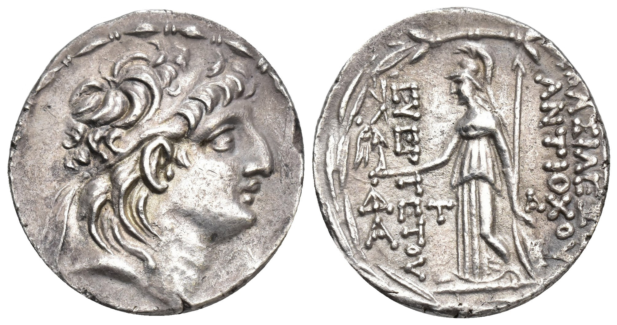 GRECIA ANTIGUA. REYES SELÉUCIDAS. Antíoco VII. Tetradracma (138-129 a.C.). A/ Cabeza diademada a der. R/ Atenea a izq., en campo T-A y monograma; BASILEWS/ANTIOXOU/EVERGETOU. AR 15,91 g. 28 mm. Pequeñas marcas. EBC-/MBC+.