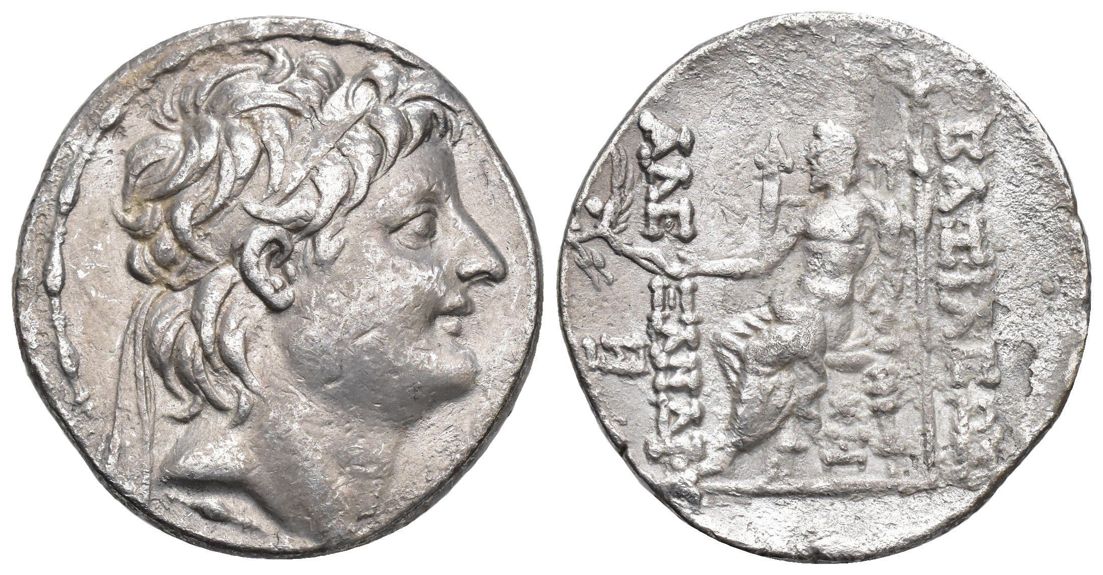 GRECIA ANTIGUA. REYES SELÉUCIDAS. Alejandro II Zabinas. Antioquía. Tetradracma (128-123 a.C.). A/ Cabeza diademada a der. R/ Zeus entronizado a izq., delante monograma, debajo del trono estrella y sigma. AR 16,07 g. 30,01 mm. COP-362 var. monogr. Concreciones en rev. MBC/BC+.