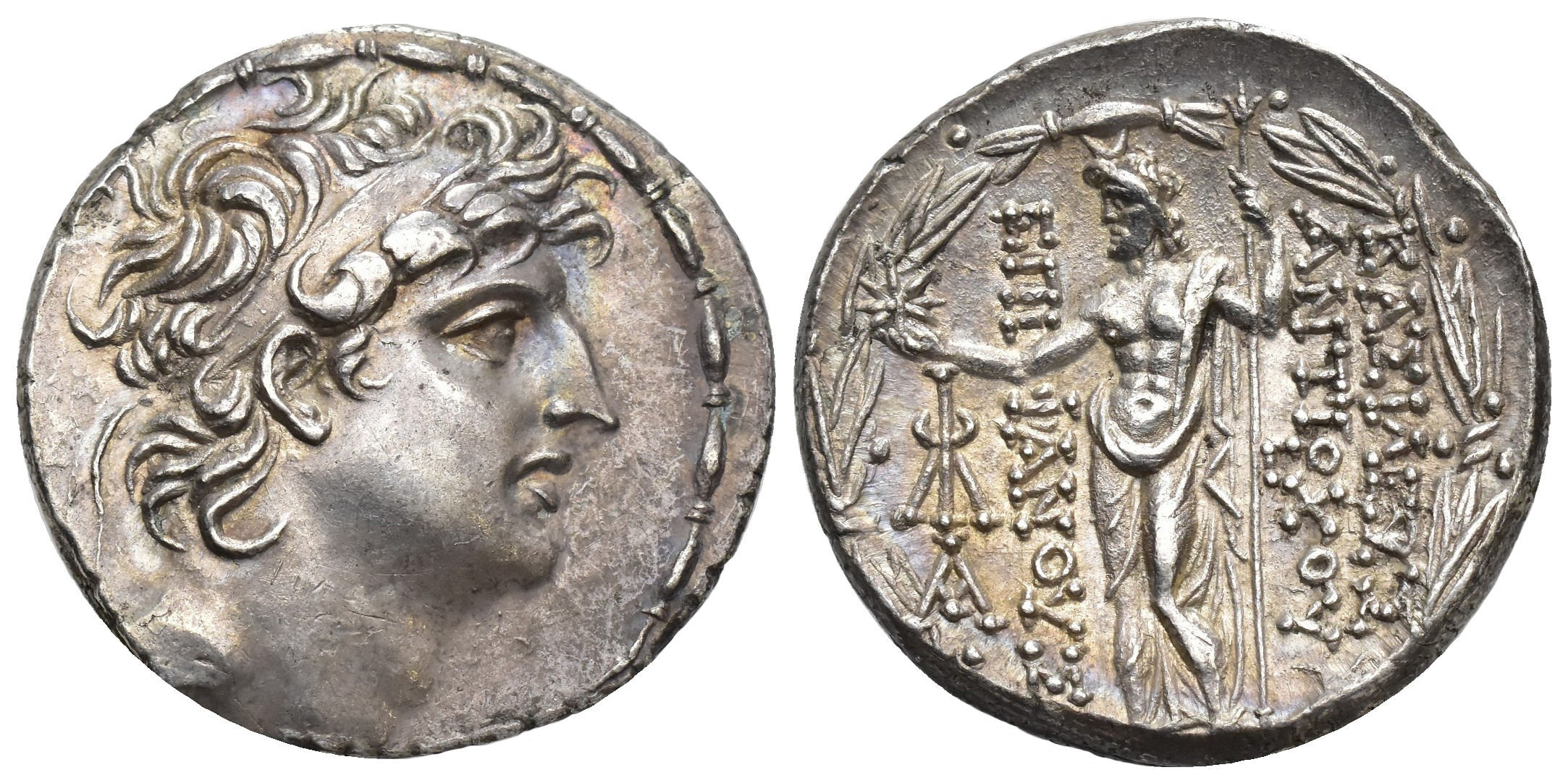 GRECIA ANTIGUA. REYES SELÉUCIDAS. Antioco VIII. Tetradracma (121-96 a.C.). A/ Cabeza diademada a der. R/ Zeus Uranio a izq., en campo A y monograma, detrás gamma, todo dentro de láurea. AR 16,21 g. 29,1 mm. COP-389 var. EBC.