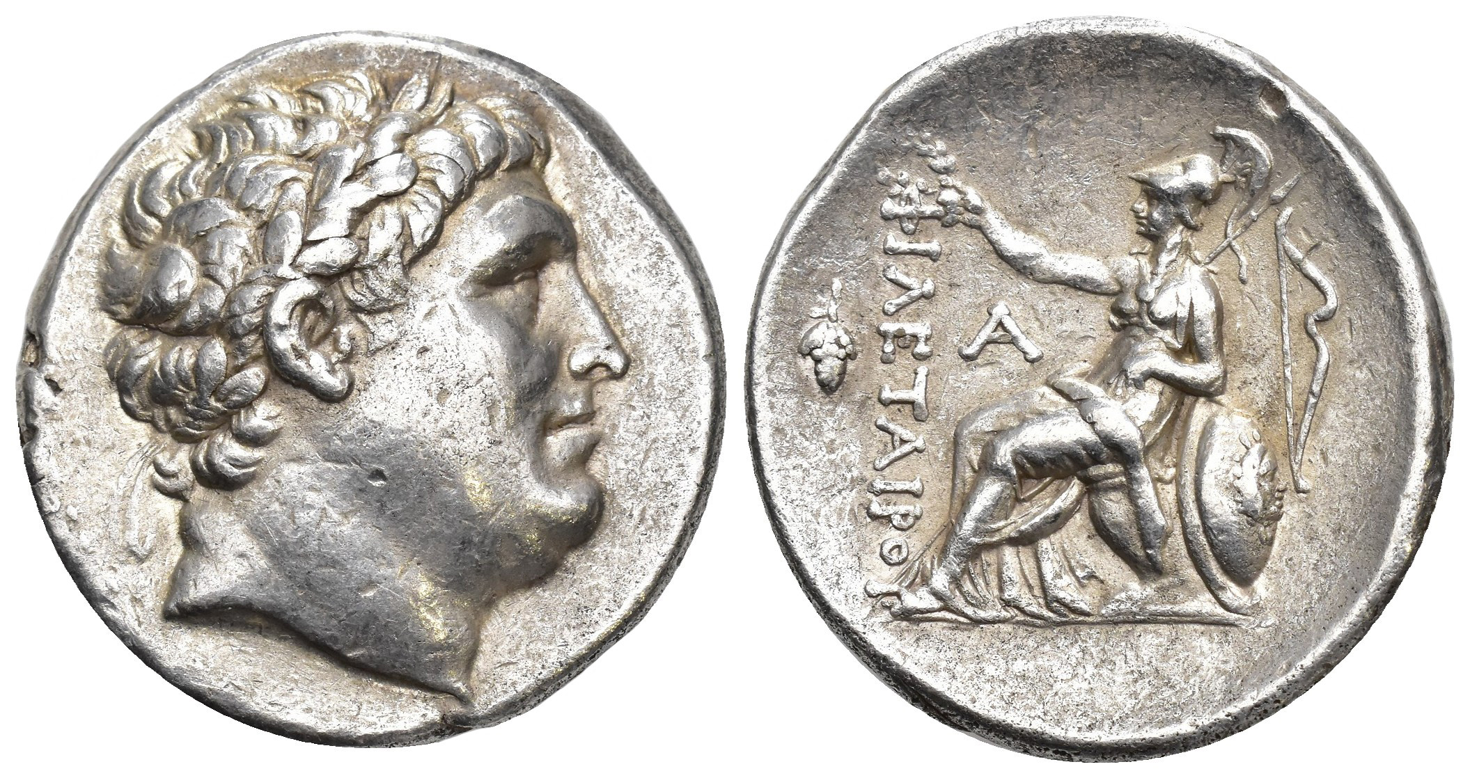 GRECIA ANTIGUA. REYES DE PÉRGAMO. Eumenes II. Tetradracma (197-159 a.C.). A/ Cabeza laureada a der. R/ Atenea sentada a izq. con corona, detrás escudo y arco, delante A y racimos de uvas; FILETAIROU. AR 16,84 g. 29,6 mm. COP-337 var. MBC+. Escasa.
