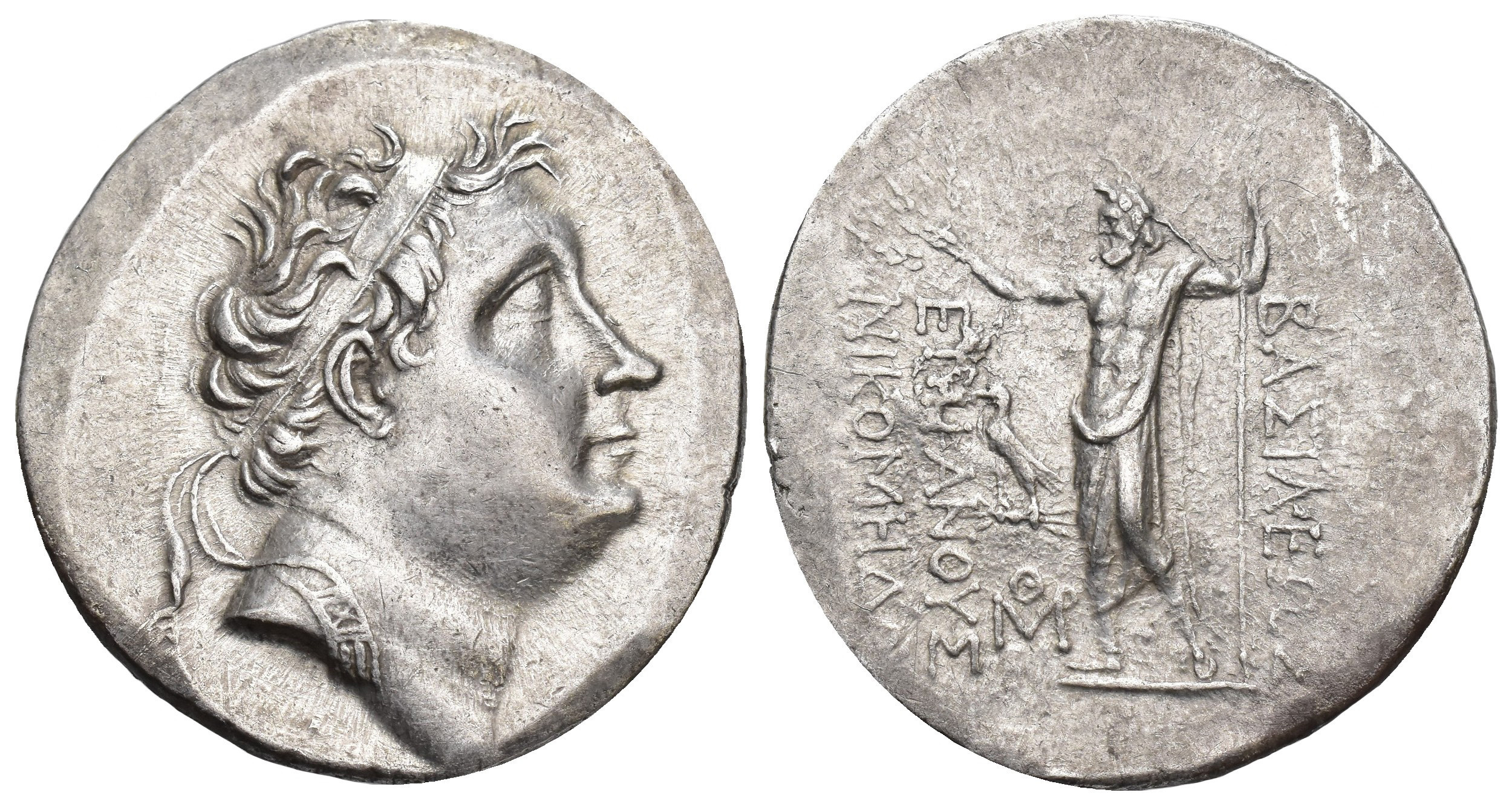 GRECIA ANTIGUA. BITINIA. Nicomedes II. Tetradracma (149-127 a.C.). A/ Cabeza diademada a der. R/ Zeus a izq. con corona y cetro, delante águila sobre haz de rayos y monograma. AR 16,68 g. 35,2 mm. COP-646 ss. Var. EBC-/MBC+.